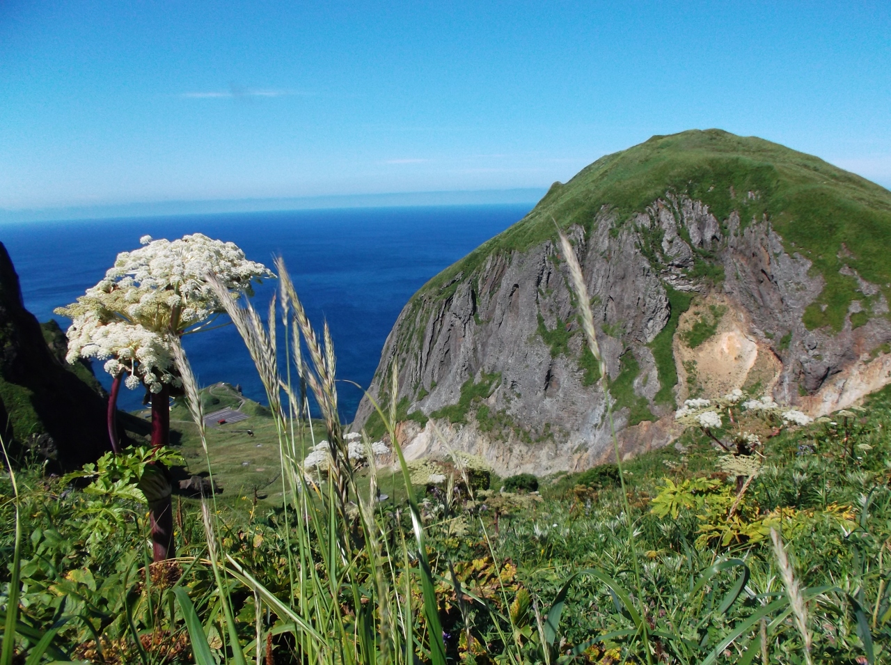 季節と天候に恵まれれば、そこは高山植物の宝庫・壮観な眺望に絶句する。青い海の彼方に利尻富士が素敵です。