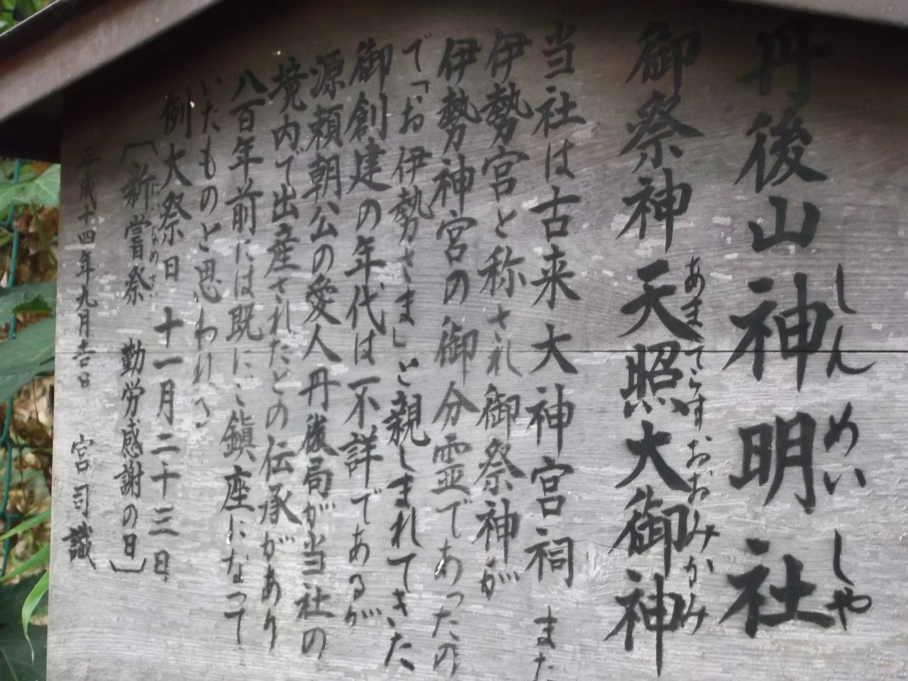 入口に掲げてある解説板によると、祭神は天照大御神、お伊勢さまと親しまれてきた・創建は不詳だが頼朝公の愛人丹後局がここ境内で出産されたとの伝承があるとあります。