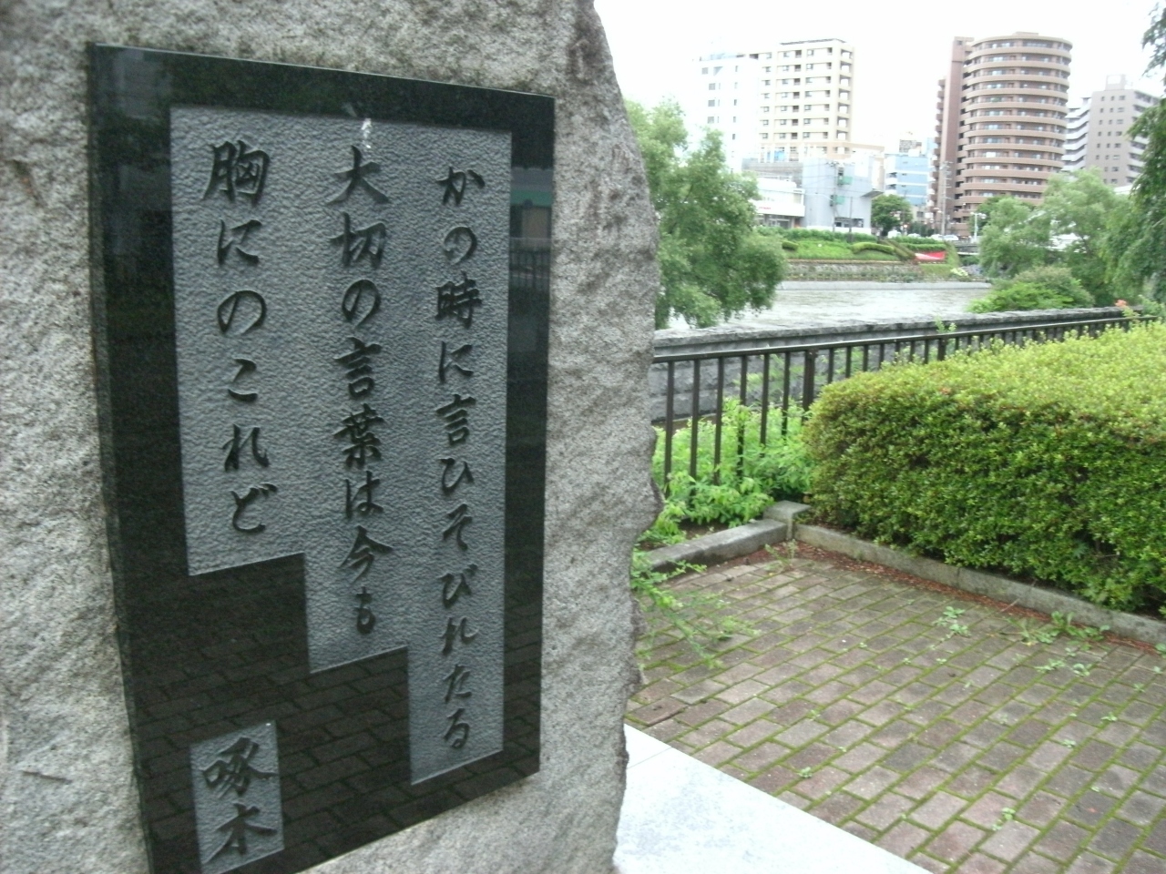 盛岡駅北口からわずか3・4分、開運橋付近から旭橋の間、北上川200米の帯状の木伏緑地。ここは別名「啄木であい道」歌・句碑(標)が点在、川べりの木々の合間にベンチ広場あり、カップルが語り合っています。観光案内の採り上げは小さいですが盛岡ならではのスポットではないでしょうか。