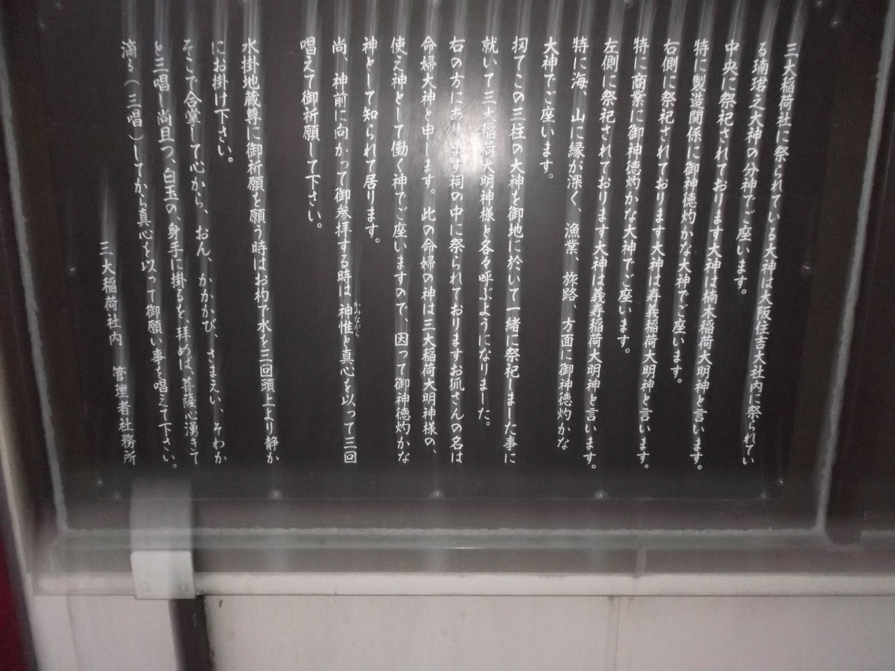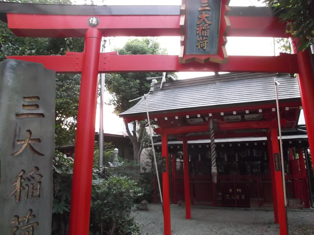 三大稲荷神社の入口にあります。お杓で水を三回地蔵さんの頭上より静かにかける、その際3唱唱えるとよいとされています(詳しくは解説板ご覧あれ)。水桶に水が少ないのでちょっと遠慮がちになりますが願掛けしました。