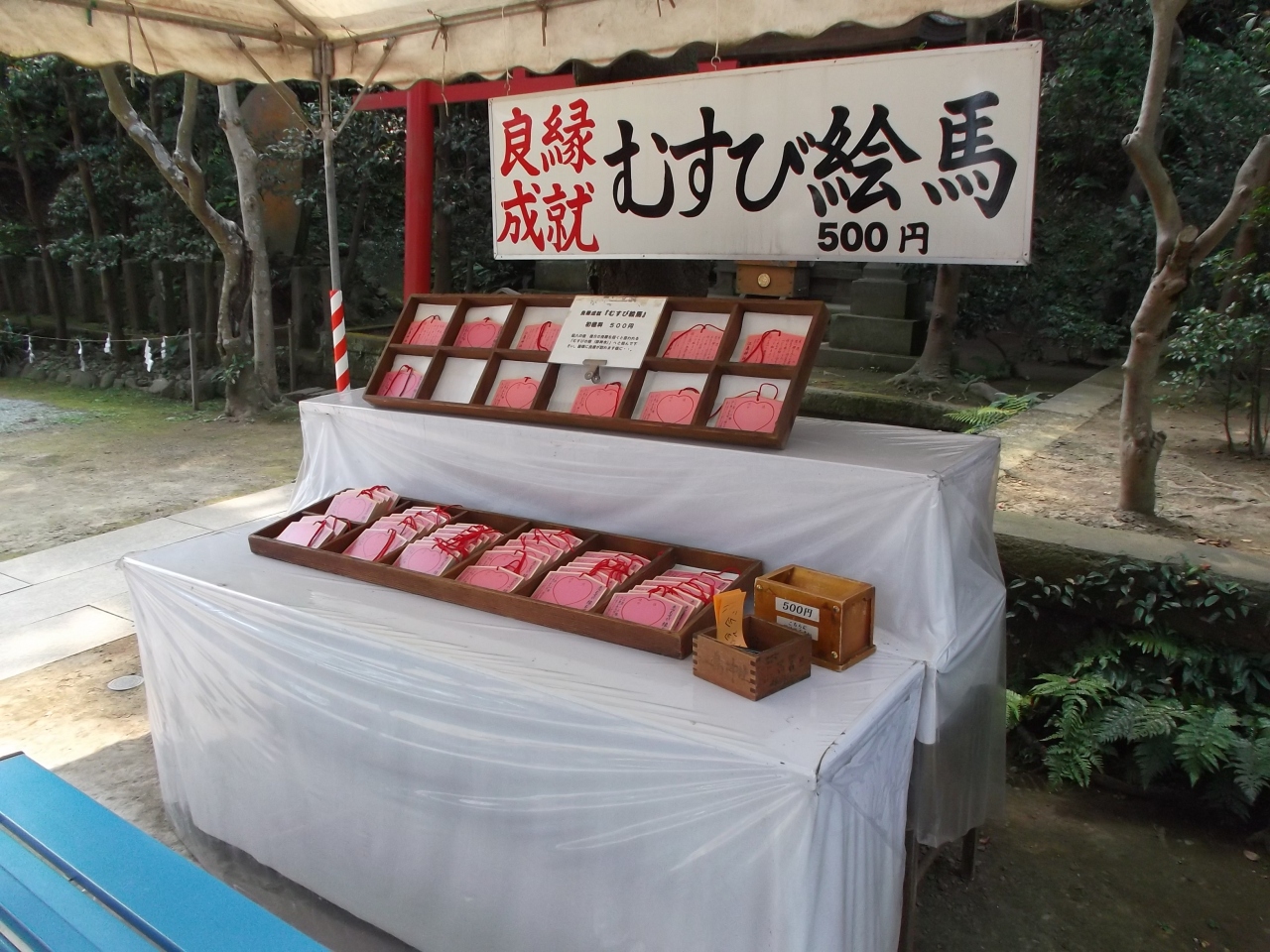 江島神社辺津宮の境内のご神木、「このいちょうのようにひとつの心(根)に結ばれると親しまれる」と解説板が掲げてあり周りにはピンクの絵馬が沢山奉納かけられています。この銀杏の大樹、幹が二つで根がひとつのため、縁に願掛け良縁求めて。境内のテントにむすびの絵馬の受付があります。