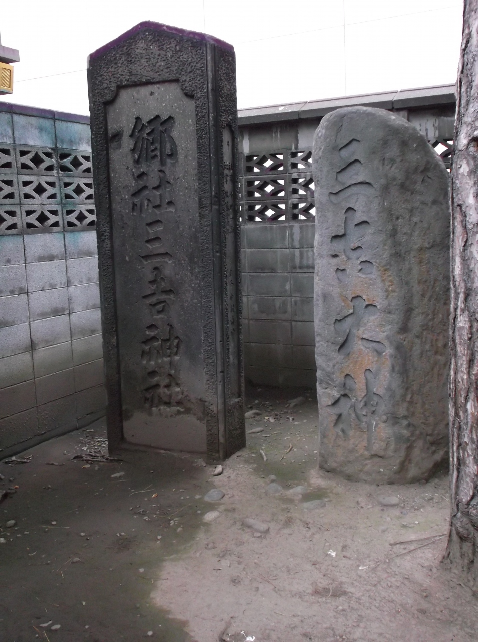 朱色の鳥居の先に神りん門、拝殿には三つの祠があります。解説板によれば、大阪住吉神社の分神、三つの大神祀るとあります。参拝は神惟(かみながら)と真心をもって3回唱えるとよいとされています(解説板)。