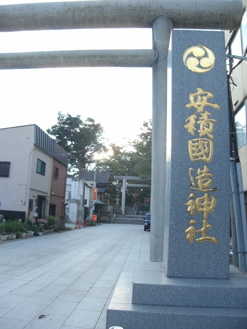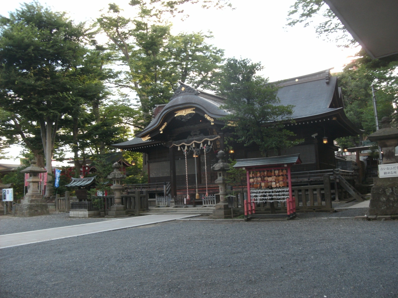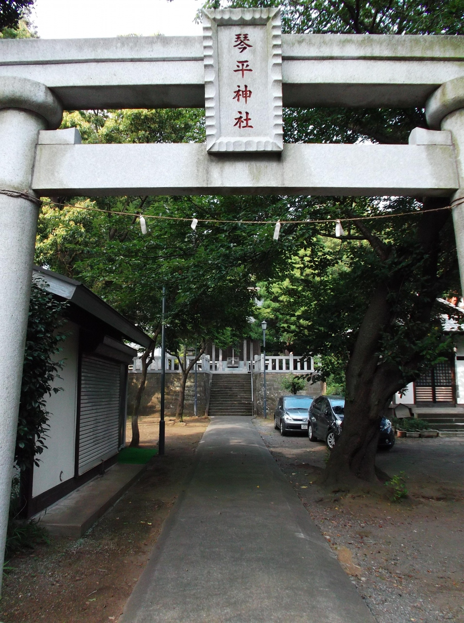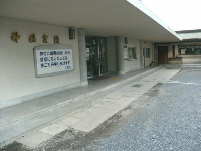 7月のこの日、神社裏手の広場(駐車場?)では夏祭りの準備に人々が追われていました。- 旅行時期