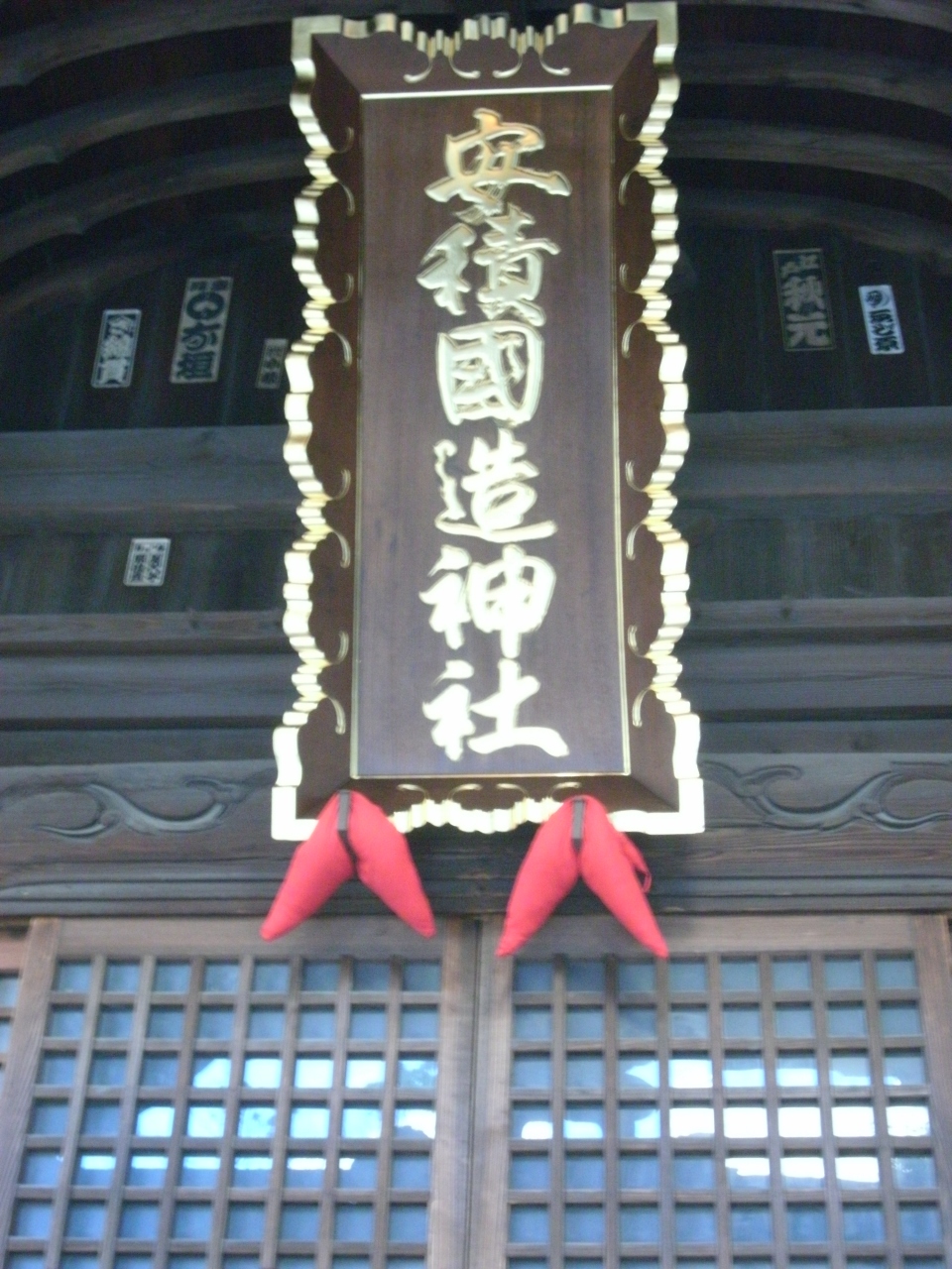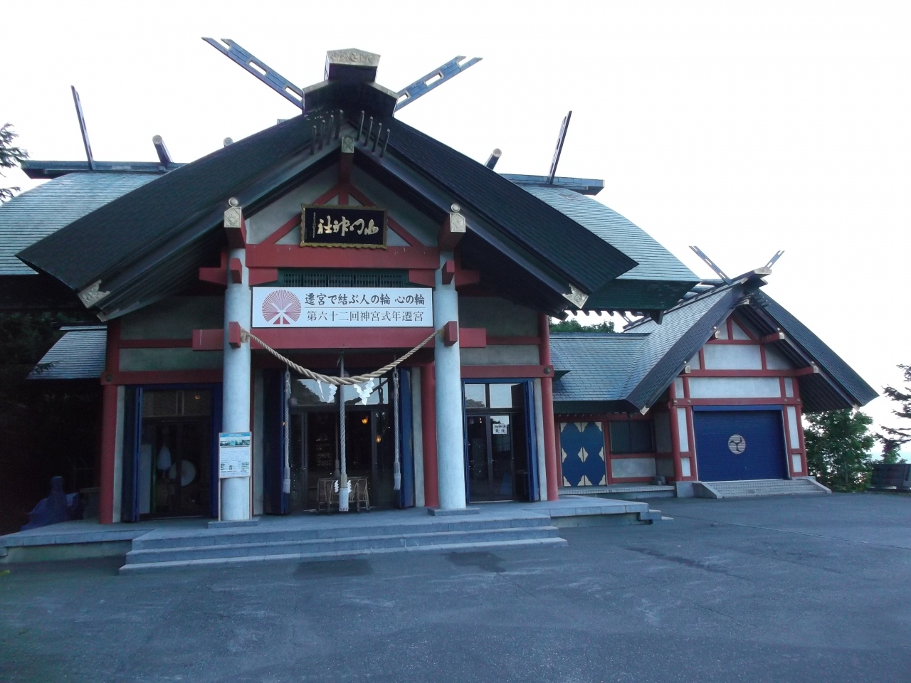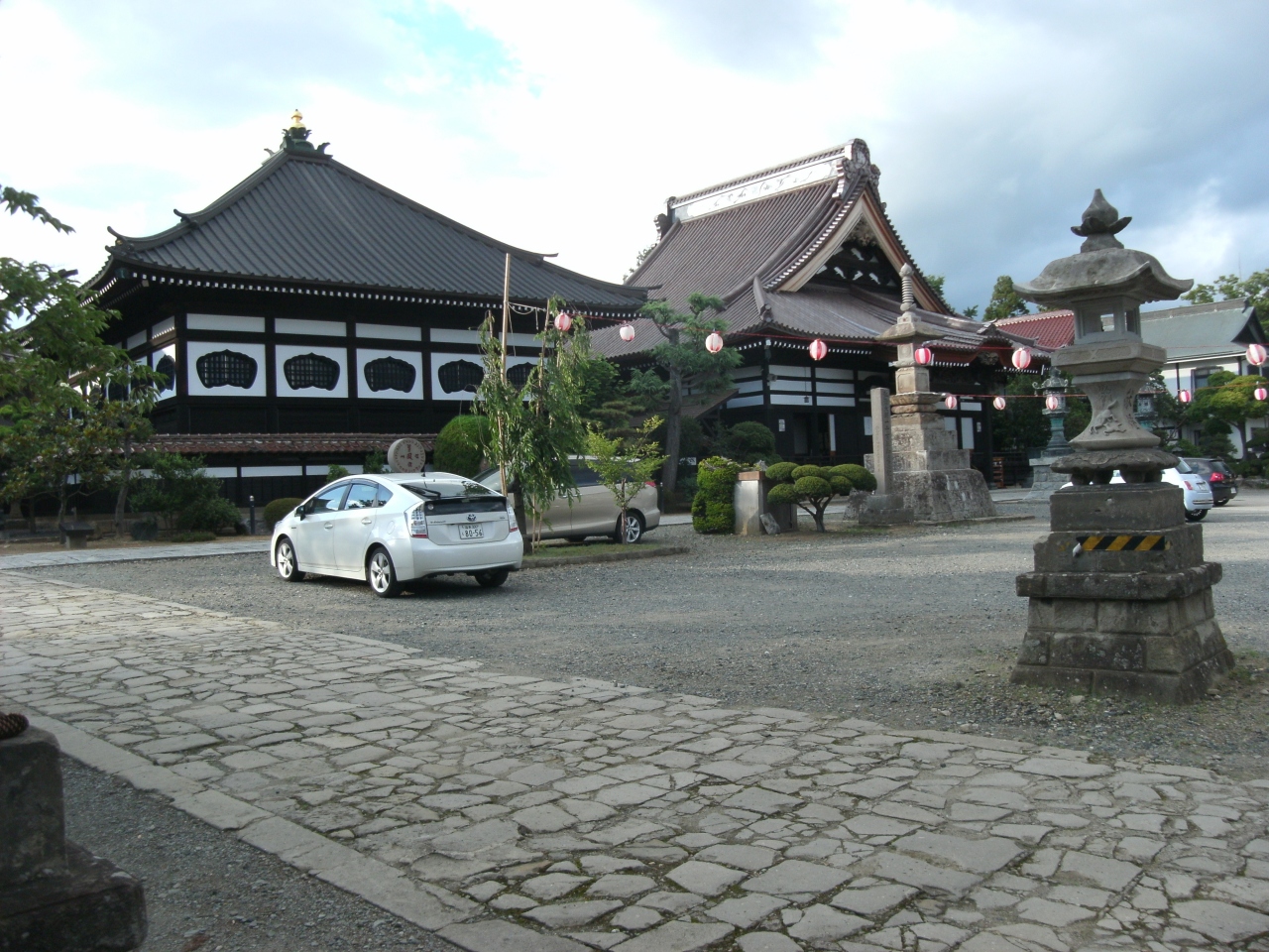 7月のこの日、神社裏手の広場(駐車場?)では夏祭りの準備に人々が追われていました。- 旅行時期
