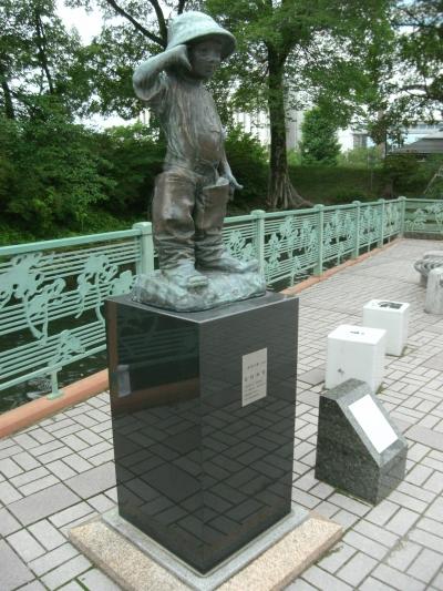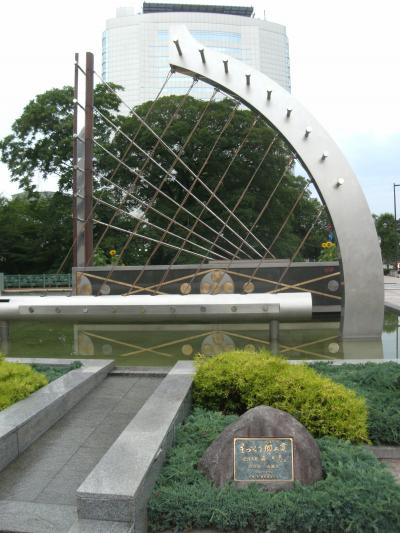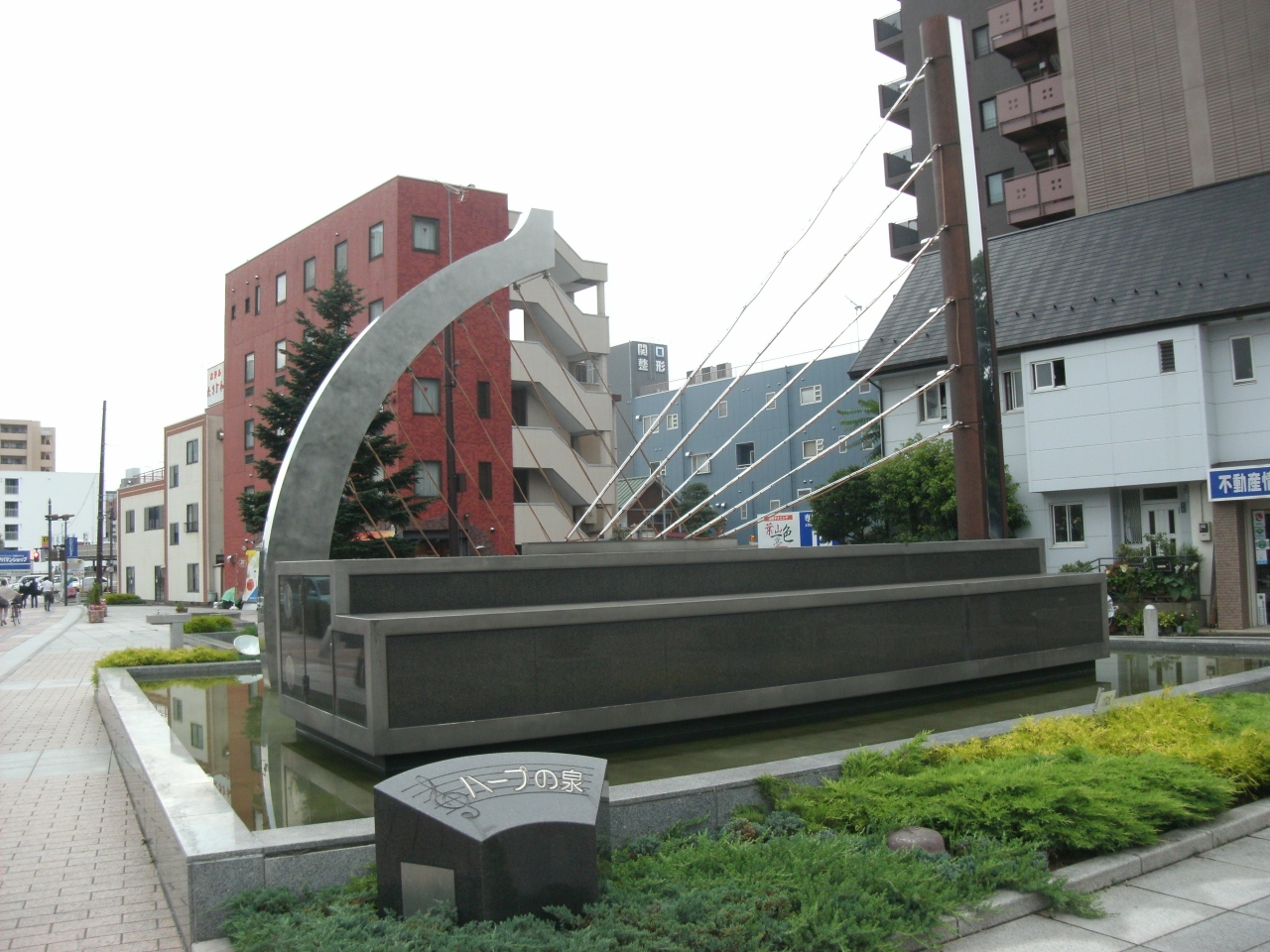 市庁舎に向かうシンフォニーロード沿いにあるせせらぎのある広場に大きなハープのモニュメントがあります。ここに「ハープの泉」と看板があります・・ココですね。舗装の空間には音符が施されているじゃありませんか。ハープの前で写真を撮るとフレームに高層建物が入るロケーション・・おしゃれ!