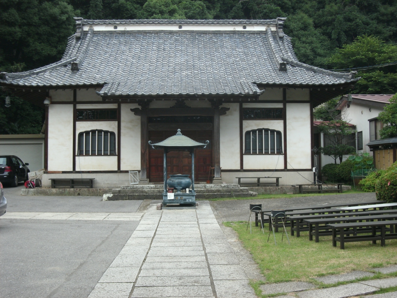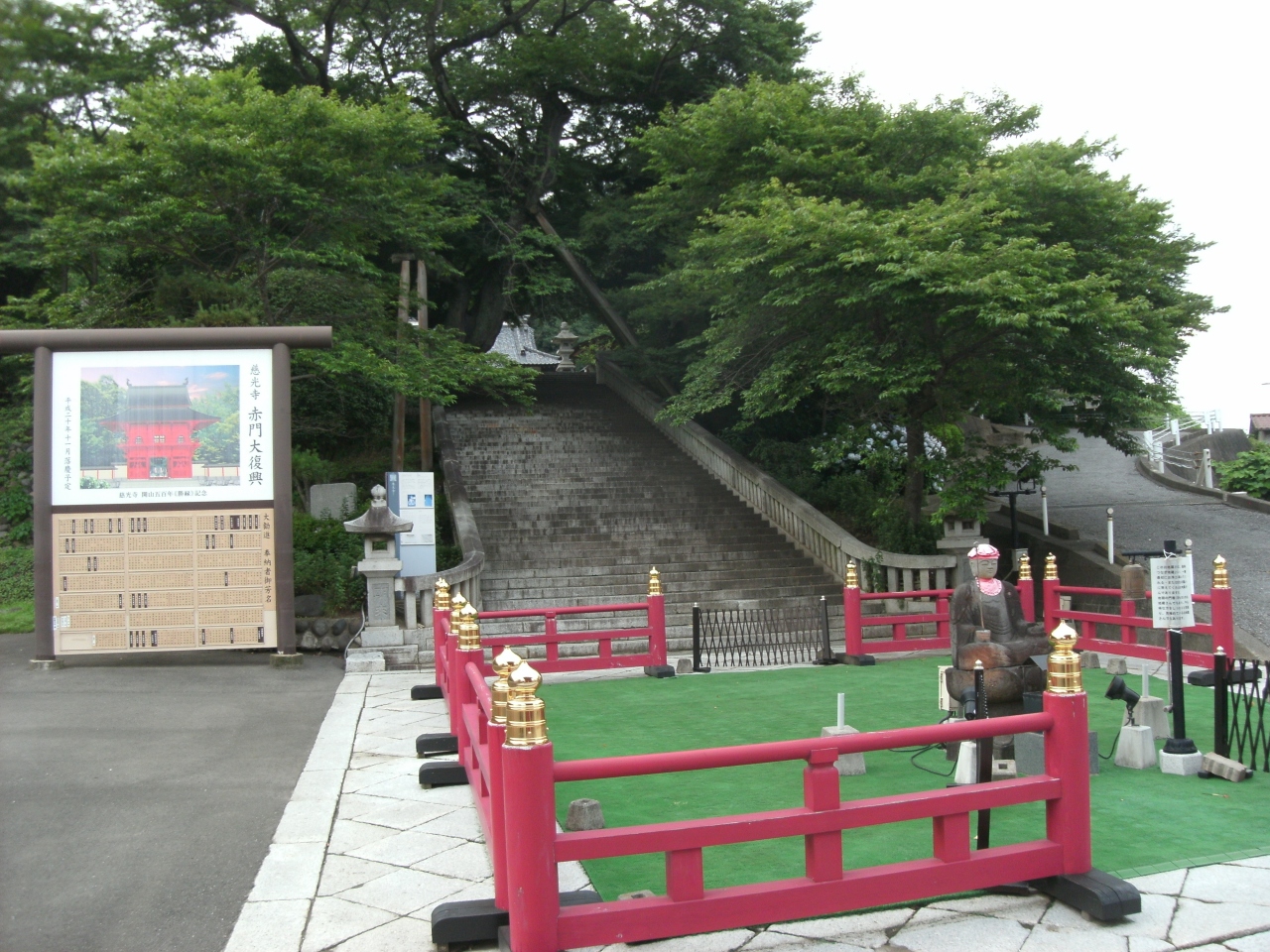 赤門・本堂境内の石段参道前の広場に南無地蔵菩薩・お地蔵さんの坐像が迎えます。なにやら意味ありげなお地蔵さんでした(案内に地獄の門番・初七日のお地蔵さんで不心得な方をしっかりと見張り見極めているとあります)。- 旅行時期