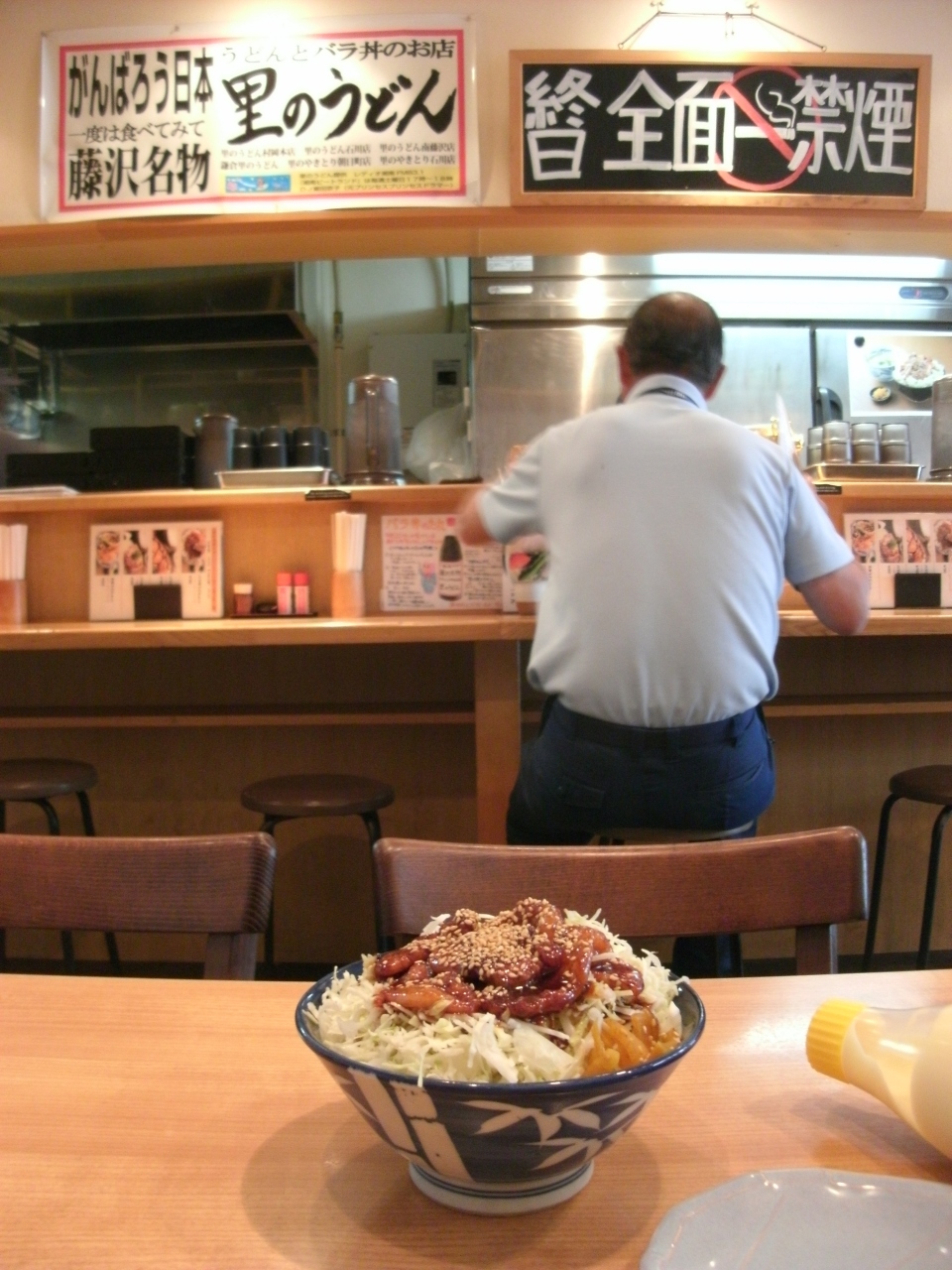 藤沢駅徒歩3・4分位の南藤沢店に行きました。うどん屋さんですが注文はもちろん名物バラ丼・・ポリュウーム満点、キャベツの上に甘辛の味付けバラ肉がのっています。お好みでとマヨネーズが、お隣のお客さんはたっぷりマヨネーズかけていました。