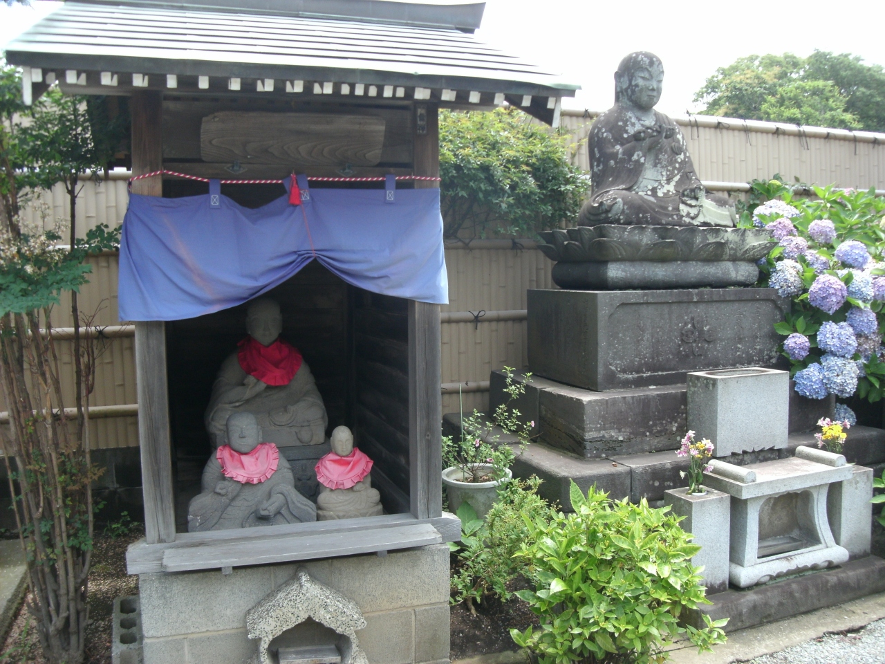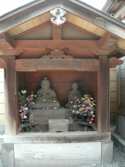 本堂に至る参道、境内の左手の小堂の中に坐像が大中小3体安置されていました。弘法大師さまです。小さいのは新しそう(地蔵さん?)。