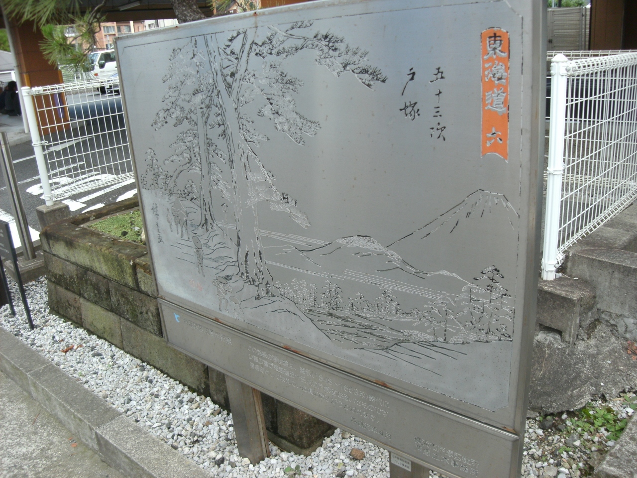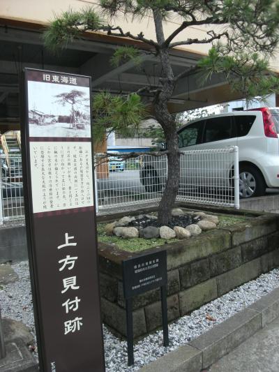 東海道京都よりに位置する上方見附には松が植えられています。ココ、戸塚宿上方見附跡の史跡にも小さいながら松が植えられていました。ところは大坂下バス停、サイゼリアの前(駐車場)。解説板と銘板の浮世絵があります。広重の戸塚宿浮世絵は区制50周年記念で建てられたもの。当時の様子うかがうことできるとの解説ありますが、ちょっと剥げ欠けているようでした(見た目)。道路反対側には跡地盾があります。