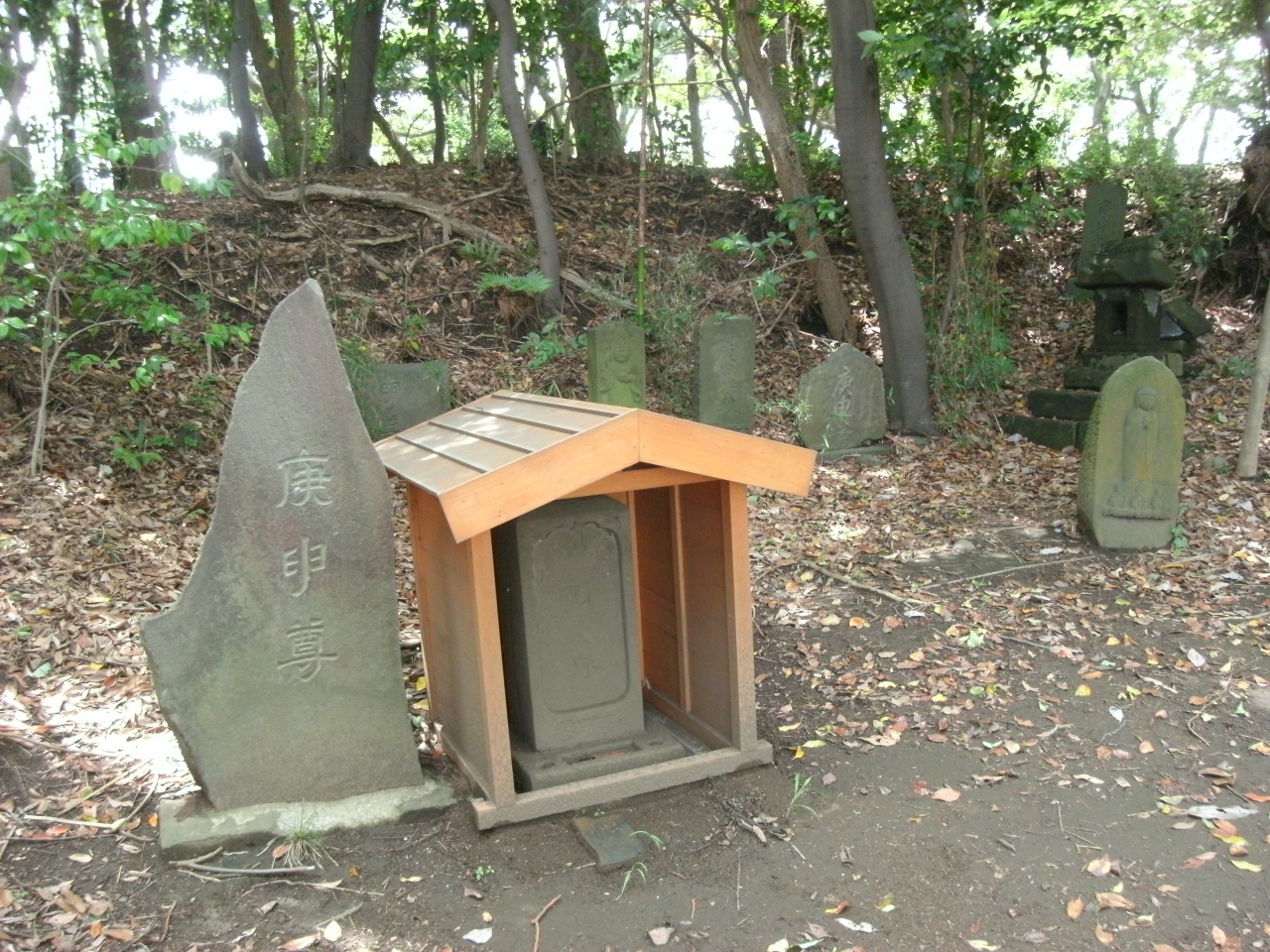 ありました・・墓地の裏手、庚申塔・古石塔類が集められているところに。まさしくひっそりと・・小堂の中に。只、刻まれている文字の判読がわかりずらい。多分そうであろうと(墓地掃除の方にお聞きしたところ間違いありませんでした)。小堂は最近のようです。