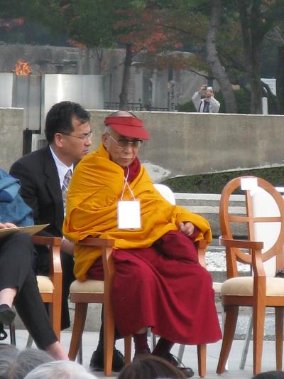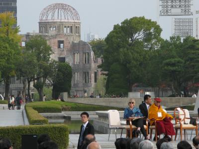 原爆ドームの前にダライ・ラマ14世。世界遺産とノーベル平和賞受賞者。う...