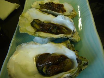 牡蠣専門店です。牡蠣の味噌焼き1600円(写真)、カキフライ1200円、土手鍋(ひとり2200円~)を注文。土手鍋には白菜、ゴボウ、きのこ類などの上に、牡蠣がふんだんにのせらています。最後はおじやで締めくくり。初めての味わいに感激でした。