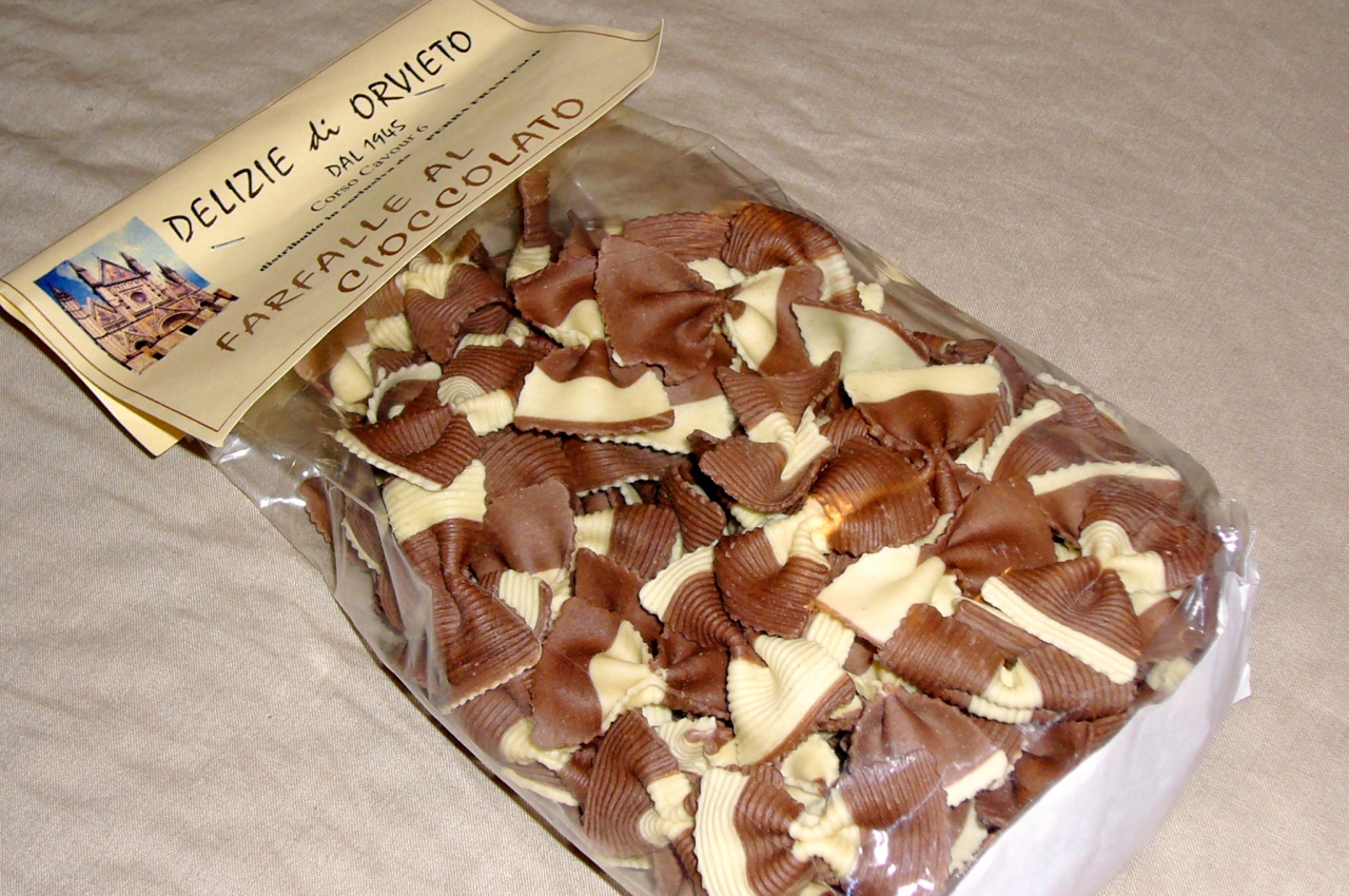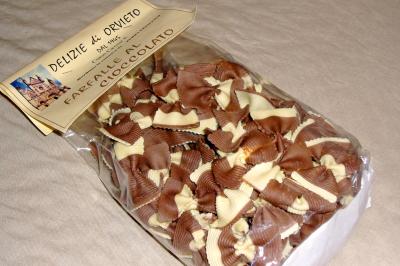 リボン型のチョコレート味のパスタがある。値段は8ユーロくらい。ホワイトソースで頂くそうです。
