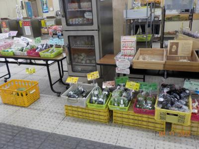 長野電鉄では改札前に野菜が売っています。さすがローカル線!