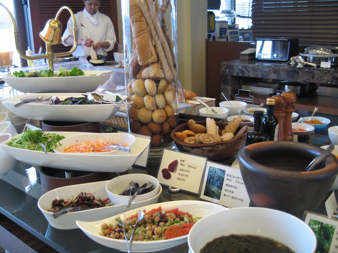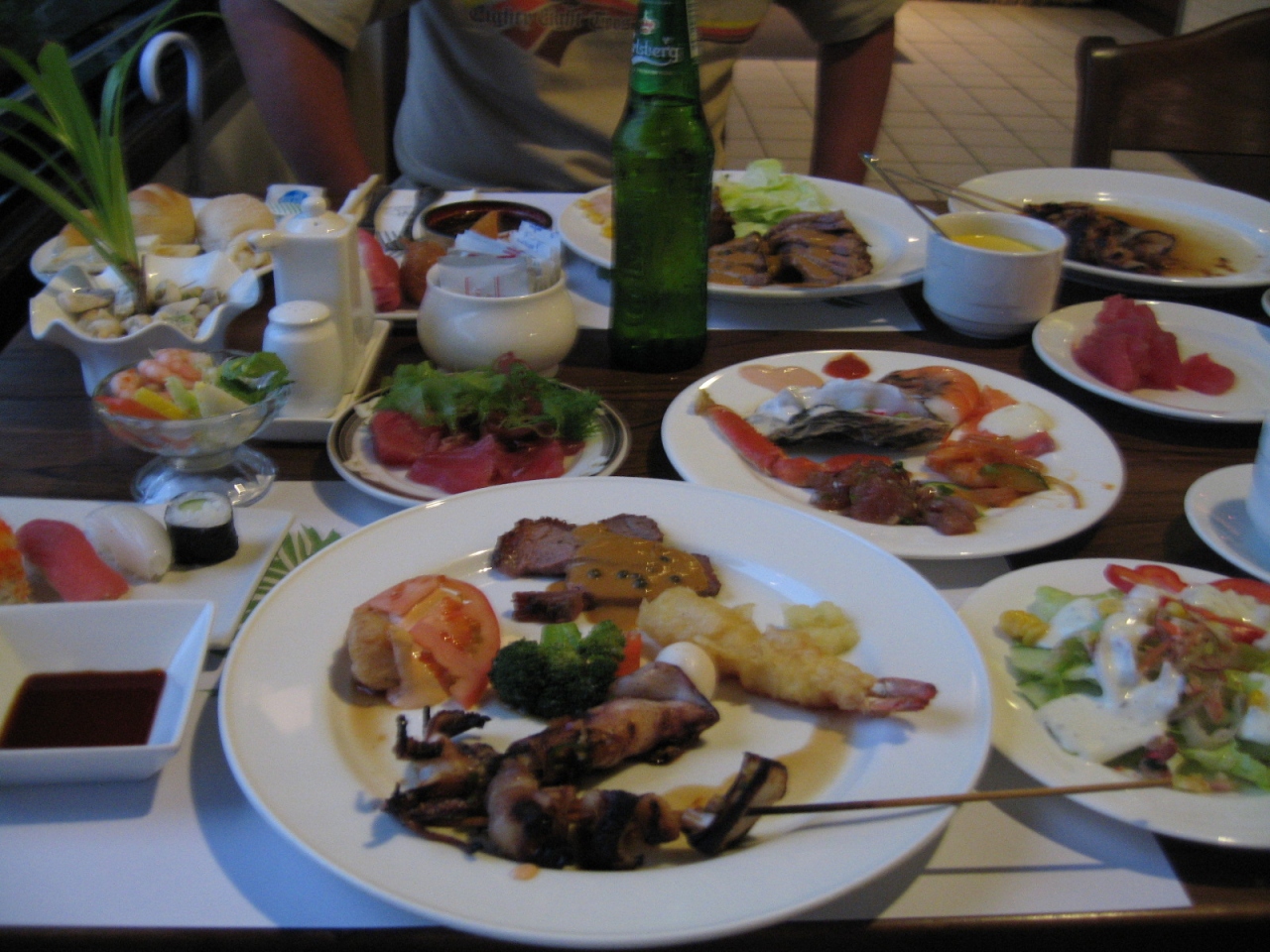 魚介類の天ぷら、焼き魚、寿司バー、サラダバーなどなど。