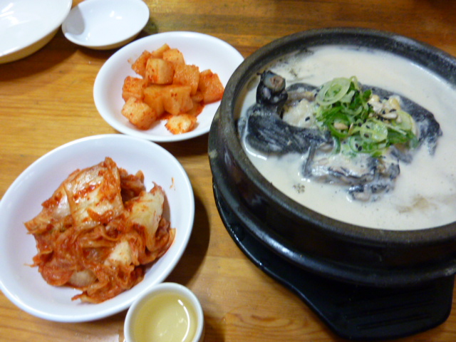 せっかくだから烏骨鶏の参鶏湯(19000w)を。見た目は黒くてグロいけど、コクのある味でとても美味しかったです。大きいので2人1つでちょうどでした。頼んだチジミはちょっと脂っこいし15000wと高いのであまりオススメしません。烏骨鶏参鶏湯だけの味なら☆5つ。身体にしみわたる味でした。