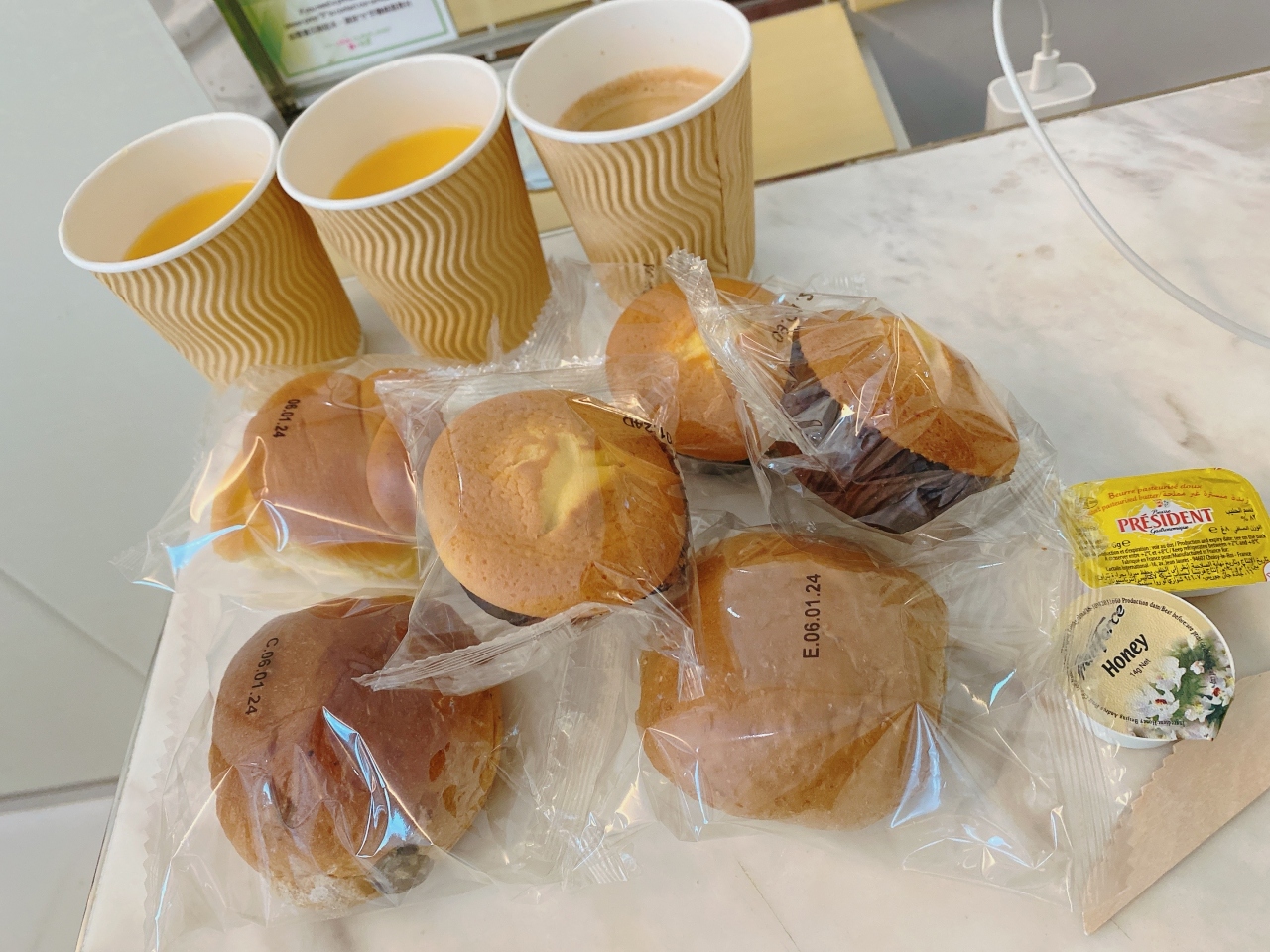 朝ロビーにパンとドリンクが数種類用意されていました。