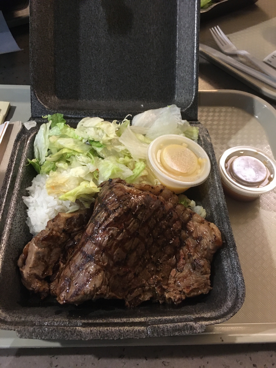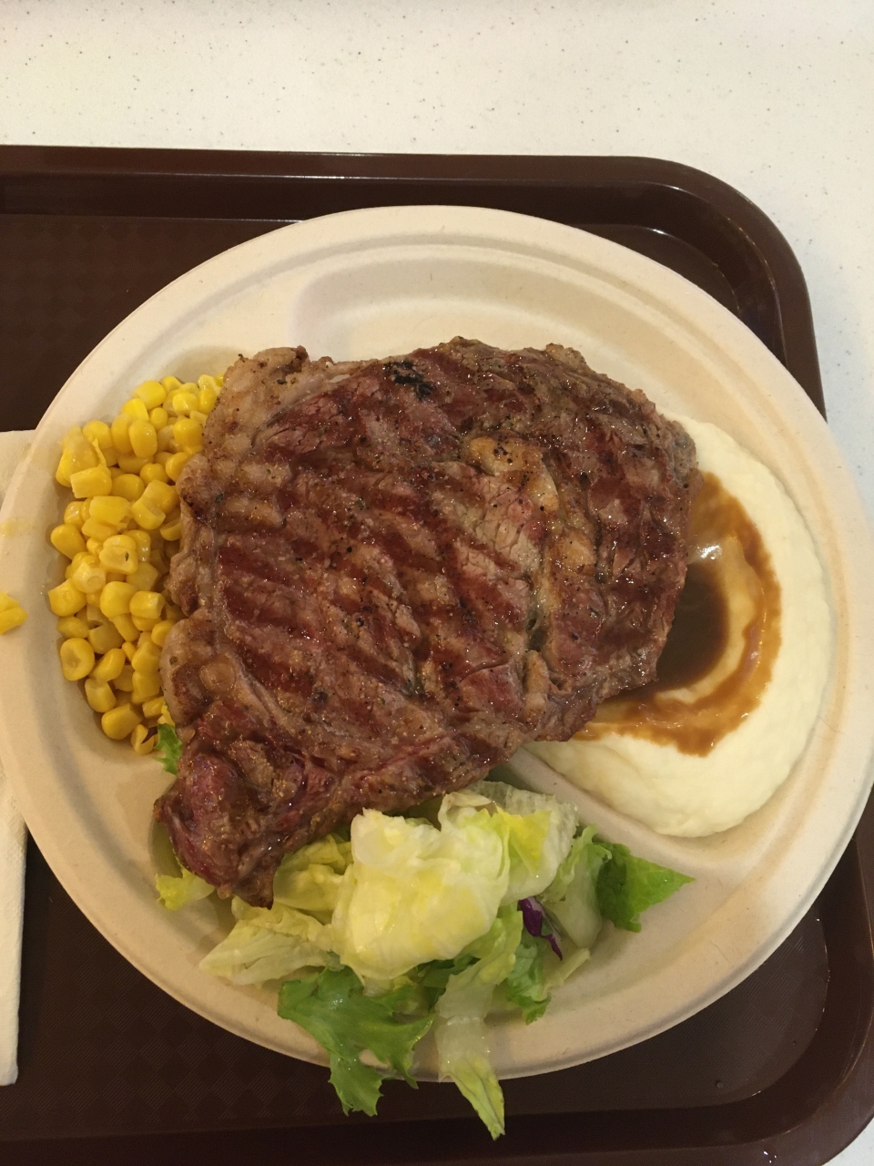 内容はステーキ、コーン、レタス、マッシュポテトで、肉は大きくて美味しかったです。- 旅行時期