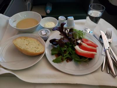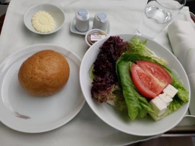 さてさて夕食。昼食から約6時間後の提供です。サラダとパン。フォカッチャ...
