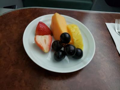 デザートはフルーツ一択でした。機内食のフルーツ、時々味がしないものもあ...