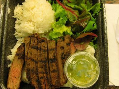 フードパントリーにあるステーキのプレートランチ店。フードパントリーにも置いてあるフリーマガジンのクーポンを使えばステーキプレートが1ドルオフになります。ステーキプレートは白米または玄米を選びサラダはグリーンサラダまたはポテトサラダを選びます。ソースは5種類の中から好きなフレーバーを選びオーダー完了です。ステーキプレートの他にもステーキスクランブル(ステーキ丼)などボリュームたっぷりで価格もリーズナブルです。夜10時まで営業しているので、フードパントリーに行ったついでに寄ることもできて便利です。