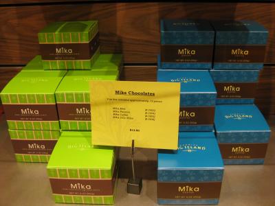 チョコレートは大人気のMikaチョコレート(フレーバーはコーヒー、パッション、ミント、梅塩の4種類です)の他ハワイアンマカダミアナッツチョコレート(ミルクチョコ、ダークチョコの2種類)などが販売されています。