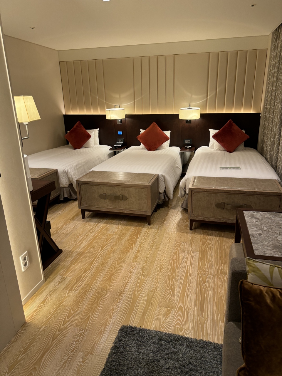 - 私が泊まった部屋は高層階トリプルルームだったのですが、3人がゆっくりできる広さだったベッドの足元にはそれぞれ大きい引き出しが付いていた