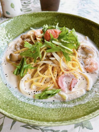 地元野菜の創作パスタや季節のデザートを益子焼の食器で食べられます。
