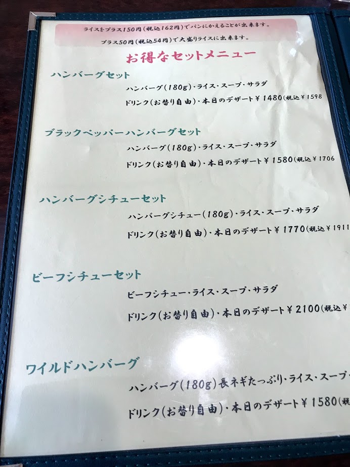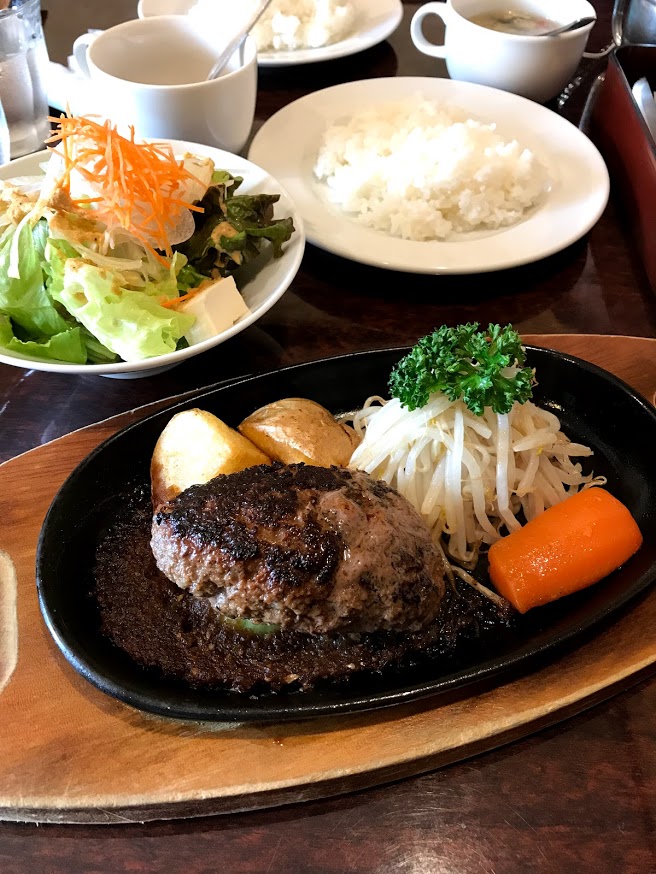 JR佐倉駅近くのハンバーグ店。車は店舗前3台とすぐ近くの駐車場(7台分)のどちらかに無料で停められます。ここは土曜でもランチメニューがあるのは有難いです。お昼時は早めがおすすめです。ここはどれも美味しいのととにかくコスパがいいです。ランチメニューのハンバーグセットは180gのハンバーグ(焼き方選べます)とライス、大きめサラダ(手作りドレッシング)、スープ、ドリンク(お替り自由・違う種類でもOK)、アイスや季節のケーキなどのデザート(約10種類から1品)まで付いて税込¥1,598!本当に安いです。