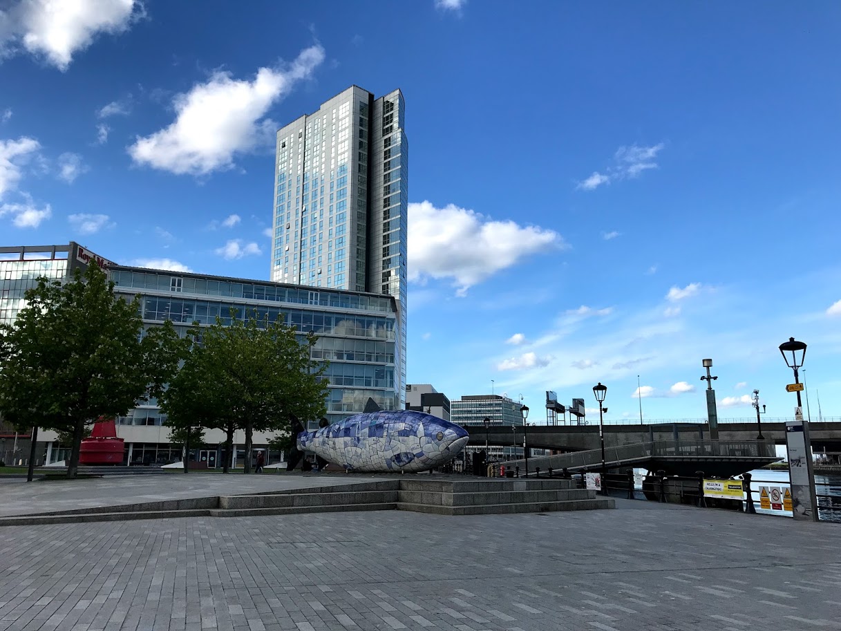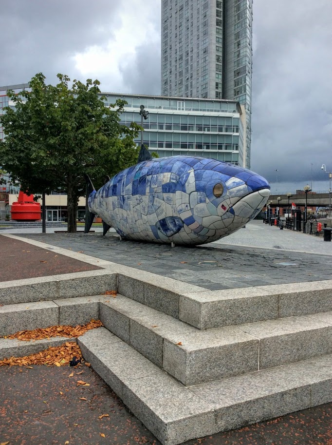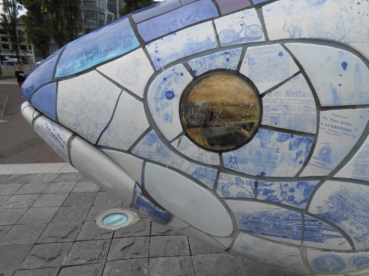 町のシンボルの1つになっているこの大きな魚はすぐ横を流れるラガン川の再生と歴史的重要性を記念して1999年にベルファスト出身のアーティストJohn Kindnessデザインで造られました。別名・知識のサーモンと言われていて全体をベルファストの歴史等が描かれたセラミックタイルで作られていて全長10m、高さが3mある名前の通り巨大な魚です。中にはタイムカプセルも入っているんだそうです。