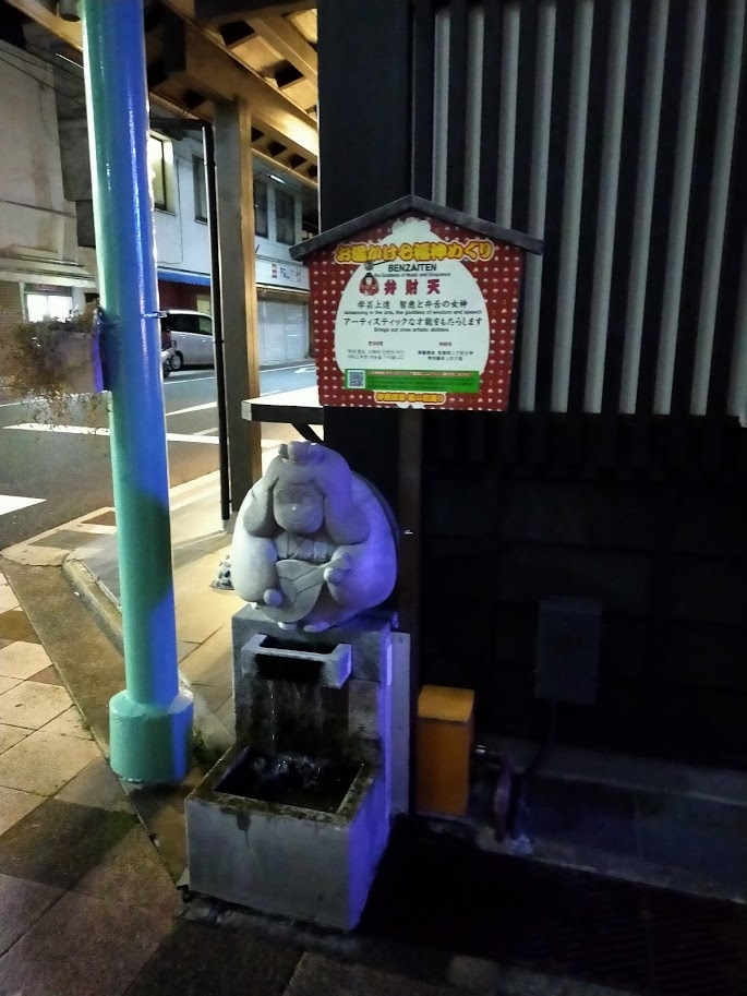 伊東駅前にある湯の花通り商店街にある「お湯かけ七福神」のひとつでアーケード街のキネマ通りのすぐ近くにあります。尊像にお湯をかけ願掛けをすると願いが叶うとされているようです。スタンプラリーもやっています。