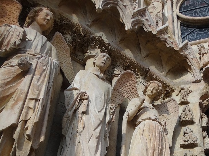 現在、正面(ファサード)の中央扉部分が修復中だけれど、両脇の扉付近の像は見学可能。