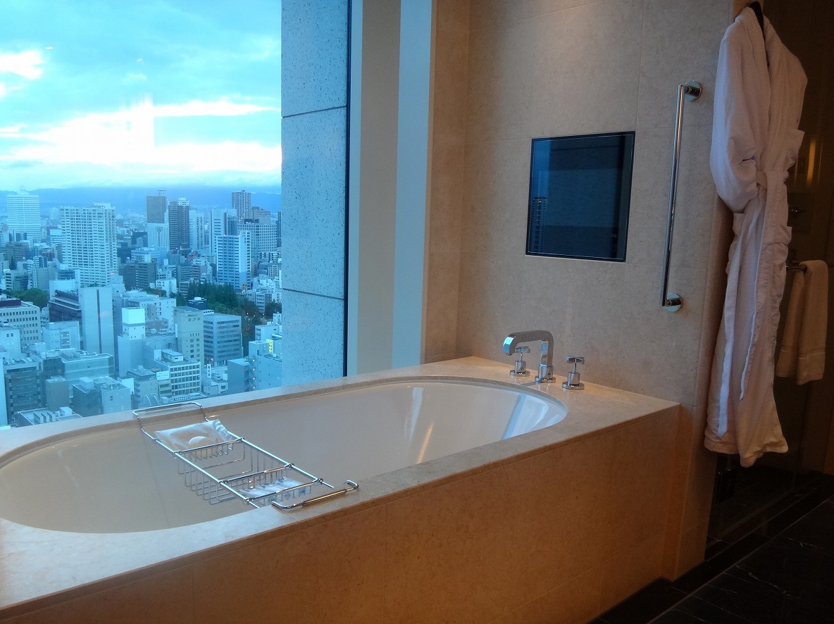 心斎橋筋にホテルの車寄せがあり、1階はベルキャプテンだけがあり、そのまま専用エレベータで上ったところにフロントがある。チェックインはカウンタとかではなく、部屋でゆっくりと。バトラーさんもついてくれて至れり尽くせり。