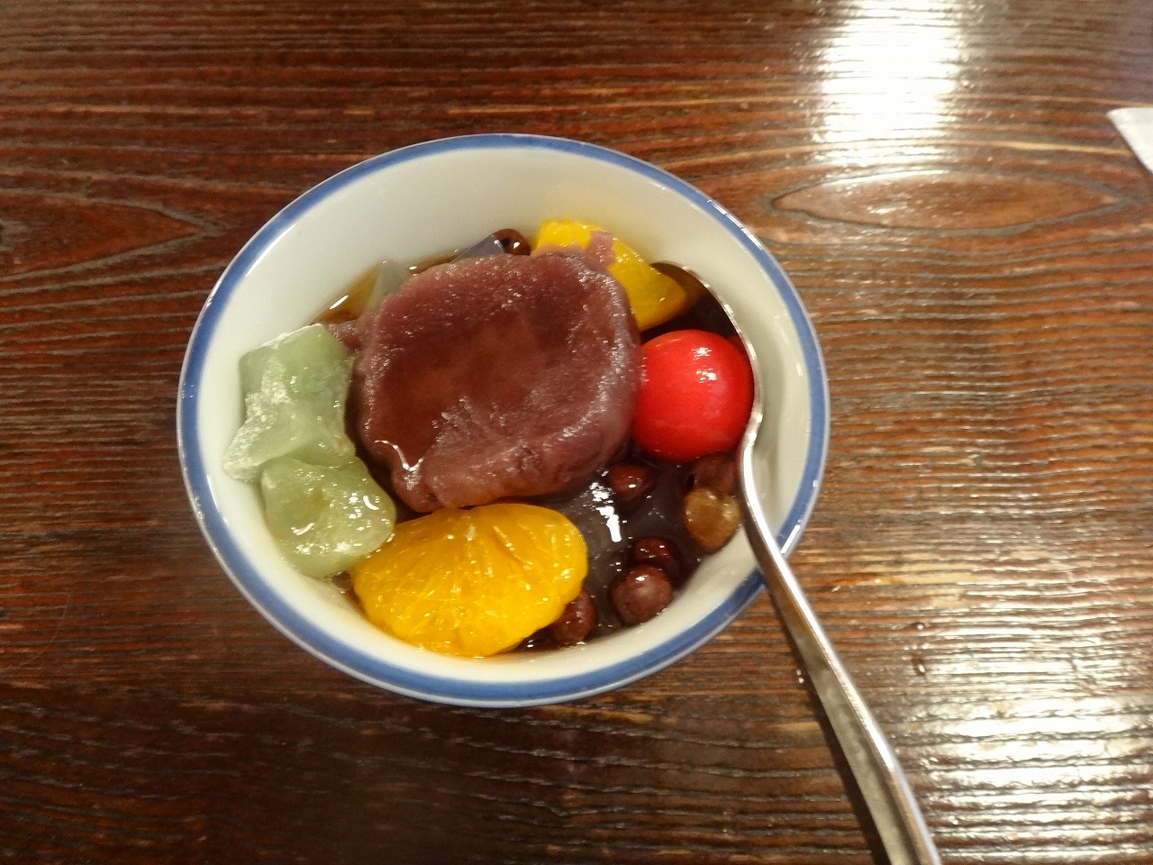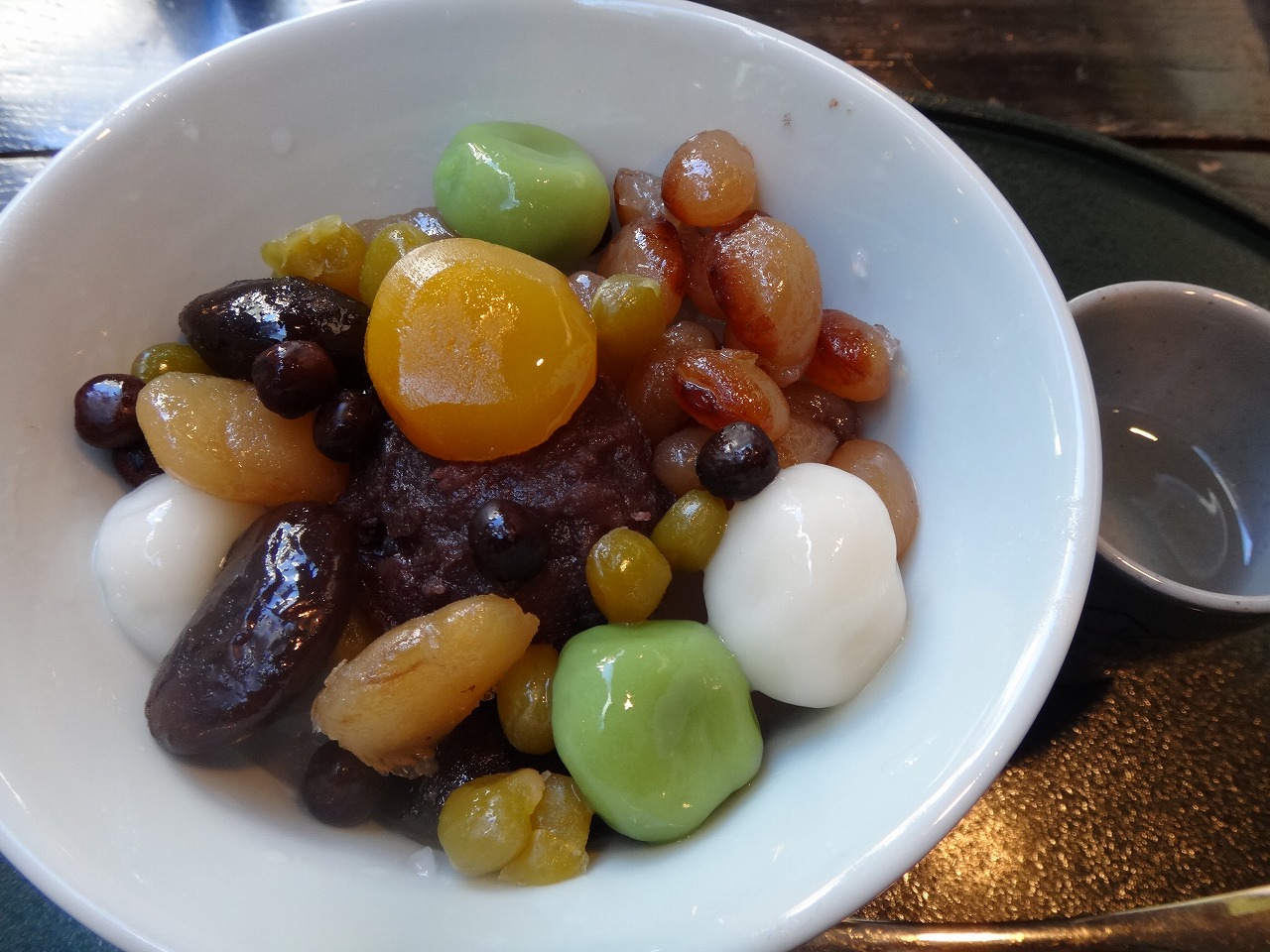 銀座鹿の子のあんみつは、いろいろな種類の豆が、ごろごろと入っています。