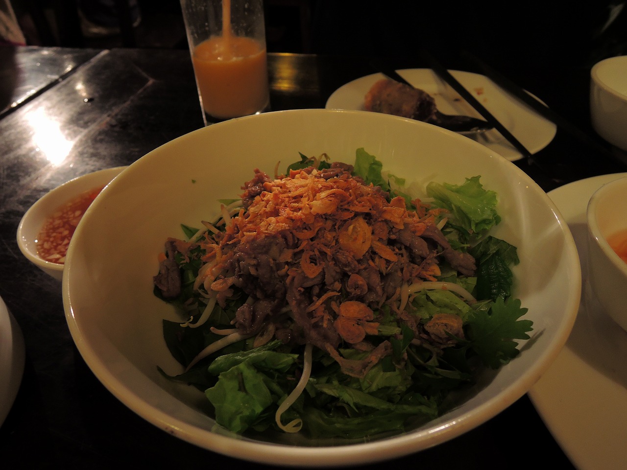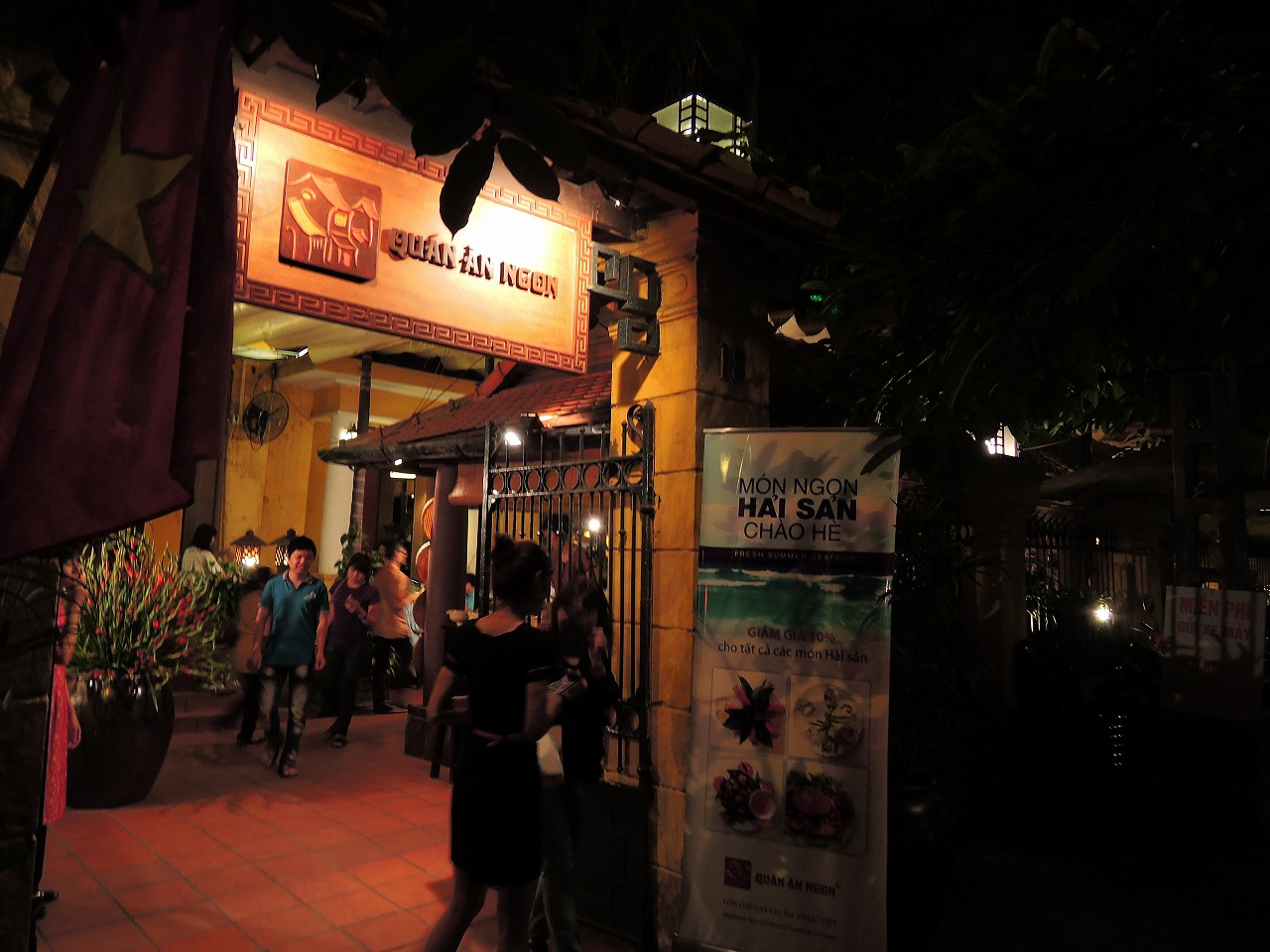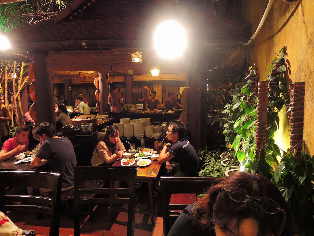 屋台村の雰囲気でとても賑やか。まずは前庭にずらりと並んだ屋台を眺め歩いて食べたいものを決め、席に着いてオーダーする。テーブル席の写真付きメニューを指差しながら、オーダーでもよい。店内は混んでいるけれど、テーブルも大きく、ゆっくりお食事ができる。是非オープンエアの席を!