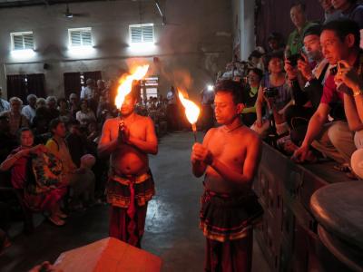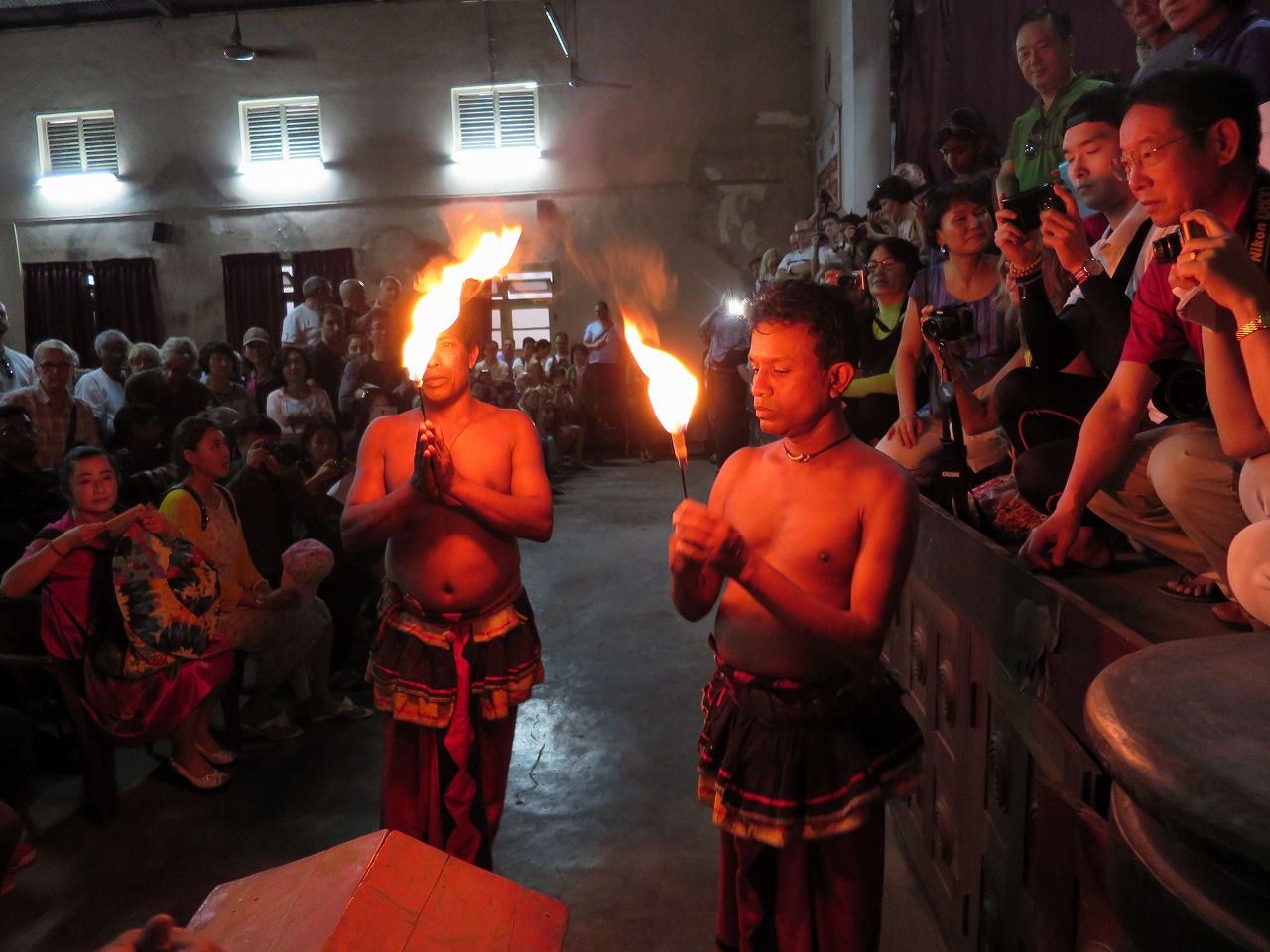 実は、当初あまり期待していなかったのですが、ショーが始まると、意外とおもしろく、あっという間にクライマックスに。演目を説明する日本語のパンフレットを見ながら、舞台を追う。次々と出し物や人が変わるので、ちっとも飽きません。法螺貝の合図で始まり、鮮やかな衣装、テンポの良いパフォーマンスが繰り広げられる。ダンスが終わると観客が席を立って舞台の方へ移動。最前列席の前に、火の入った石や炭の筵が用意され、観客のまさに目の前で、パフォーマーが走り抜ける。口から炎を吹いたり、結構、楽しめますよ。