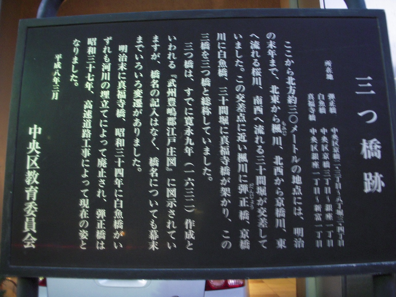 京橋の税務署近く、京橋会館の北界隈は、明治時代、三つ橋といわれていたそうだ。