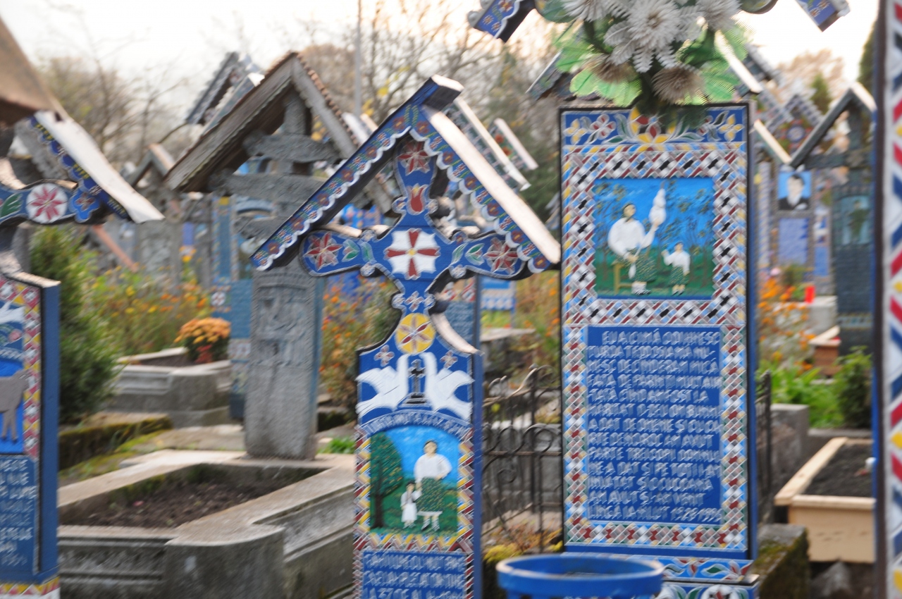 教会に隣接する墓地には、カラフルな墓標がずらりと並んでいる。その昔、お葬式の席で故人を懐かしんでいたところ、ある村人が、じゃ、その話を墓標に描こうということになり、それが恒例になったのだそうだ。今でも、彼の跡を次ぐ職人が続けている。