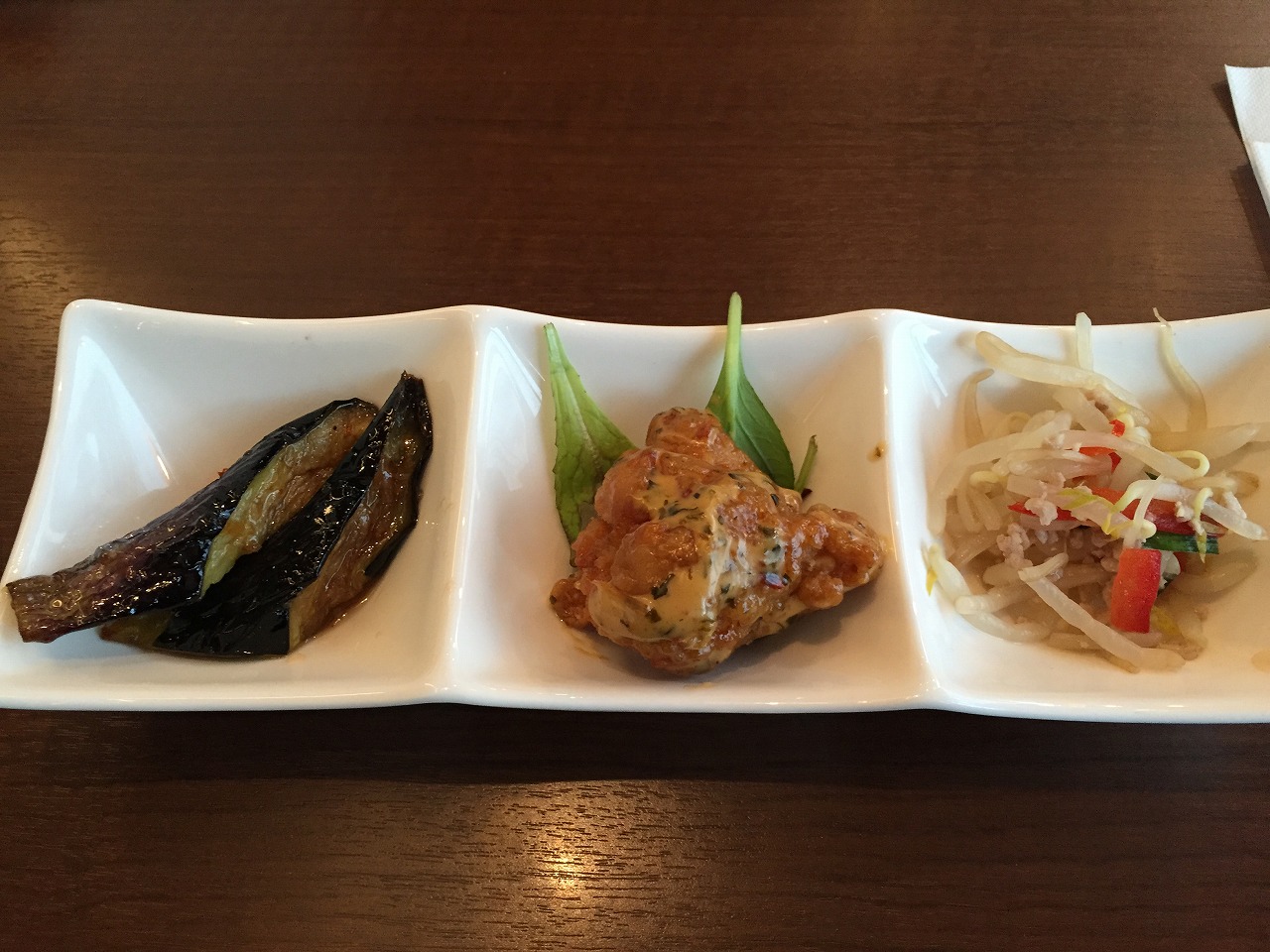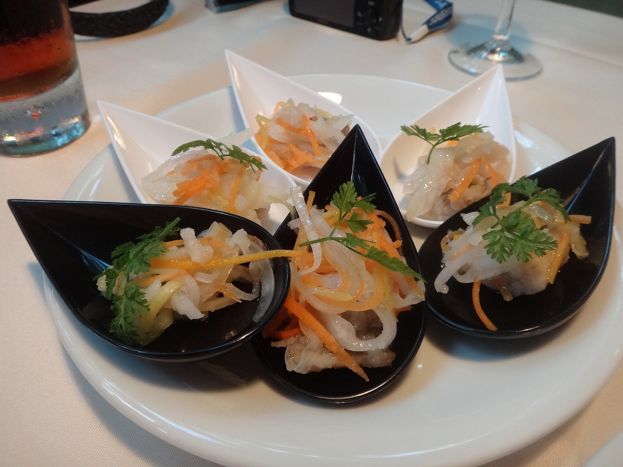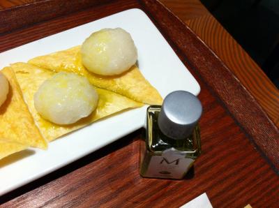 東京ミッドタウンの裏手、地下鉄の赤坂、六本木、乃木坂駅のちょうど真ん中あたりにある店。とても落ち着いた住宅地の中の店。この店は中華レストランなのだけれど、外から見るとカフェのような感じ。今日は一階でカジュアルなセットメニュー。特に前菜がかわいい。