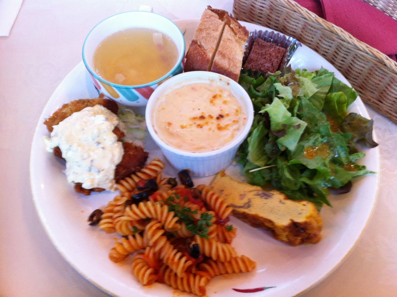 ランチプレートは、スープ、サラダ、牡蠣フライ、ショートパスタ、ドリア、オムレツ、パン、デザート、そしてコーヒーがつく。ワンプレートで出てくる。お腹一杯。- 旅行時期