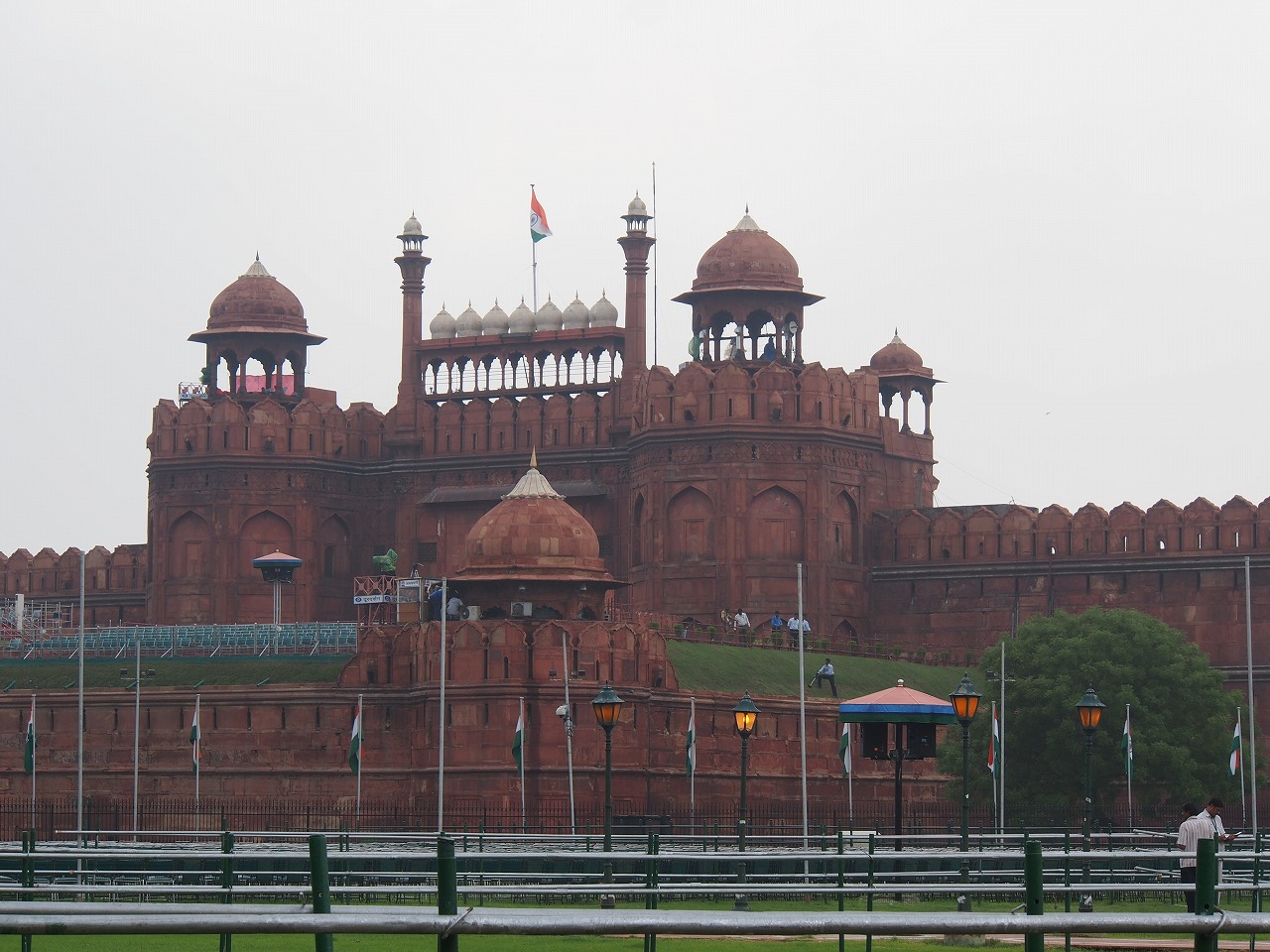レッドフォート正面の広場では、翌日に首相が演説するための防弾ガラスつきの演台など、着々と準備が進んでいました。レッドフォートは、横幅の広い大きな建物なので、正面玄関から少し外れたところから、遠景を撮影しました。