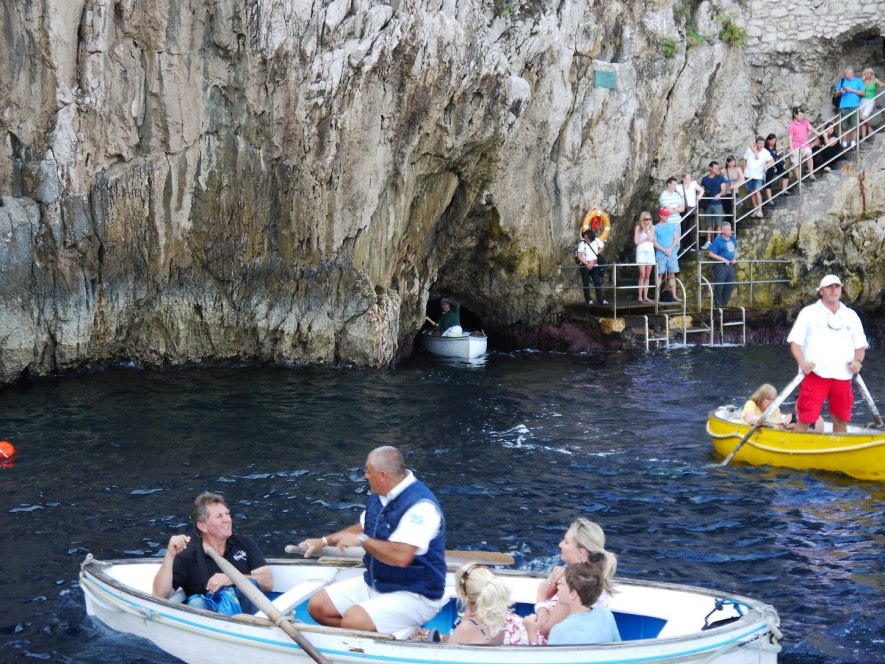 バスで行って、崖の上から階段で向かうパターンと、マリーナグランデから小型のボートでアプローチするパターンと、選択肢は2つ。いずれにしても、最後の最後は、3人乗り位の舟に乗り換える。