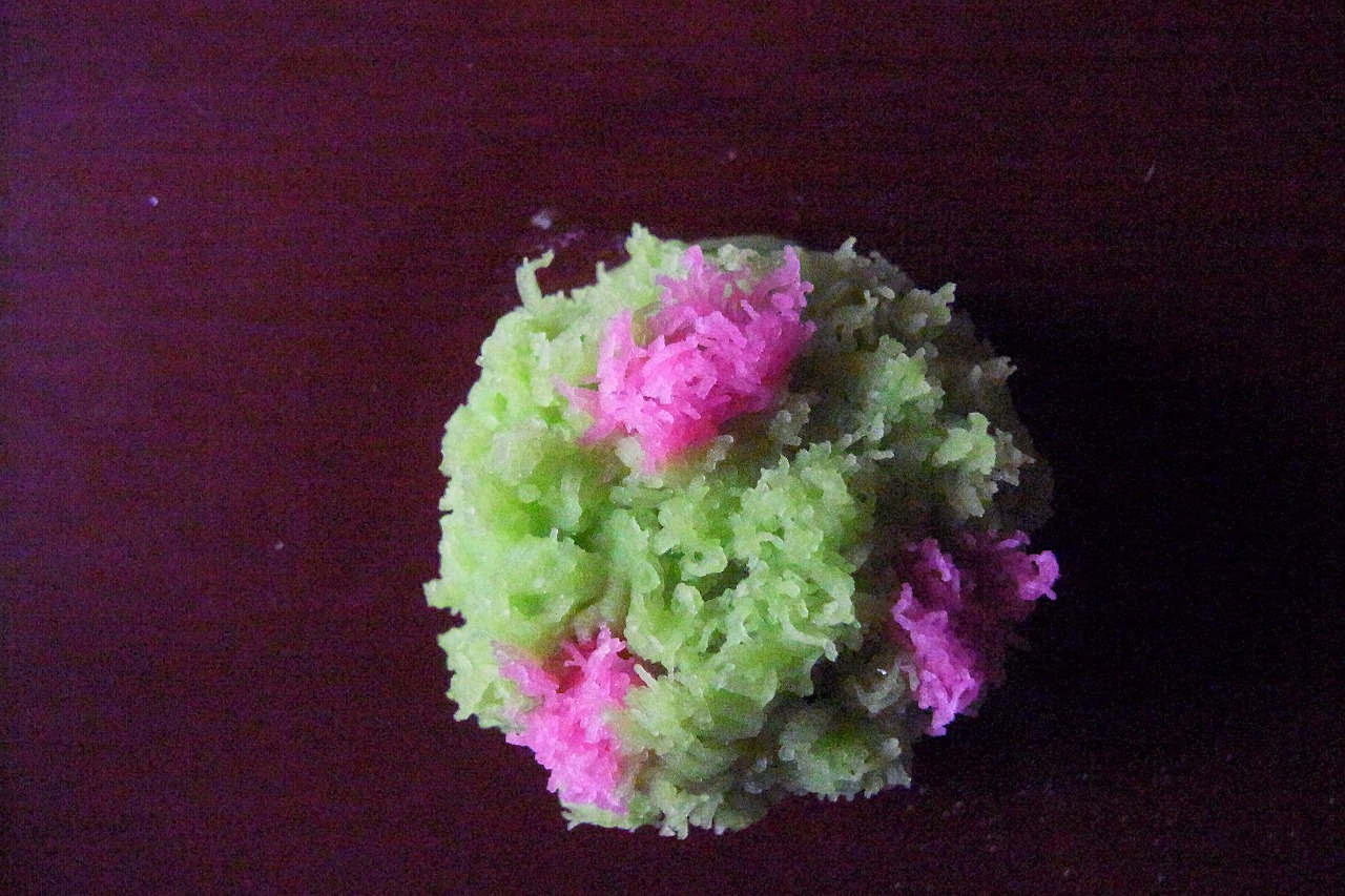 嘯月のお目当ては、きんとん。非常に細かいそぼろ。5月下旬は明るい緑の球体に、ピンクの小花が散っている。銘は岩根の躑躅。