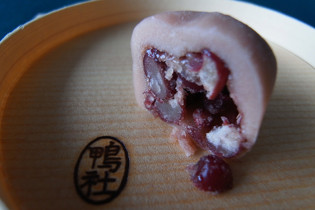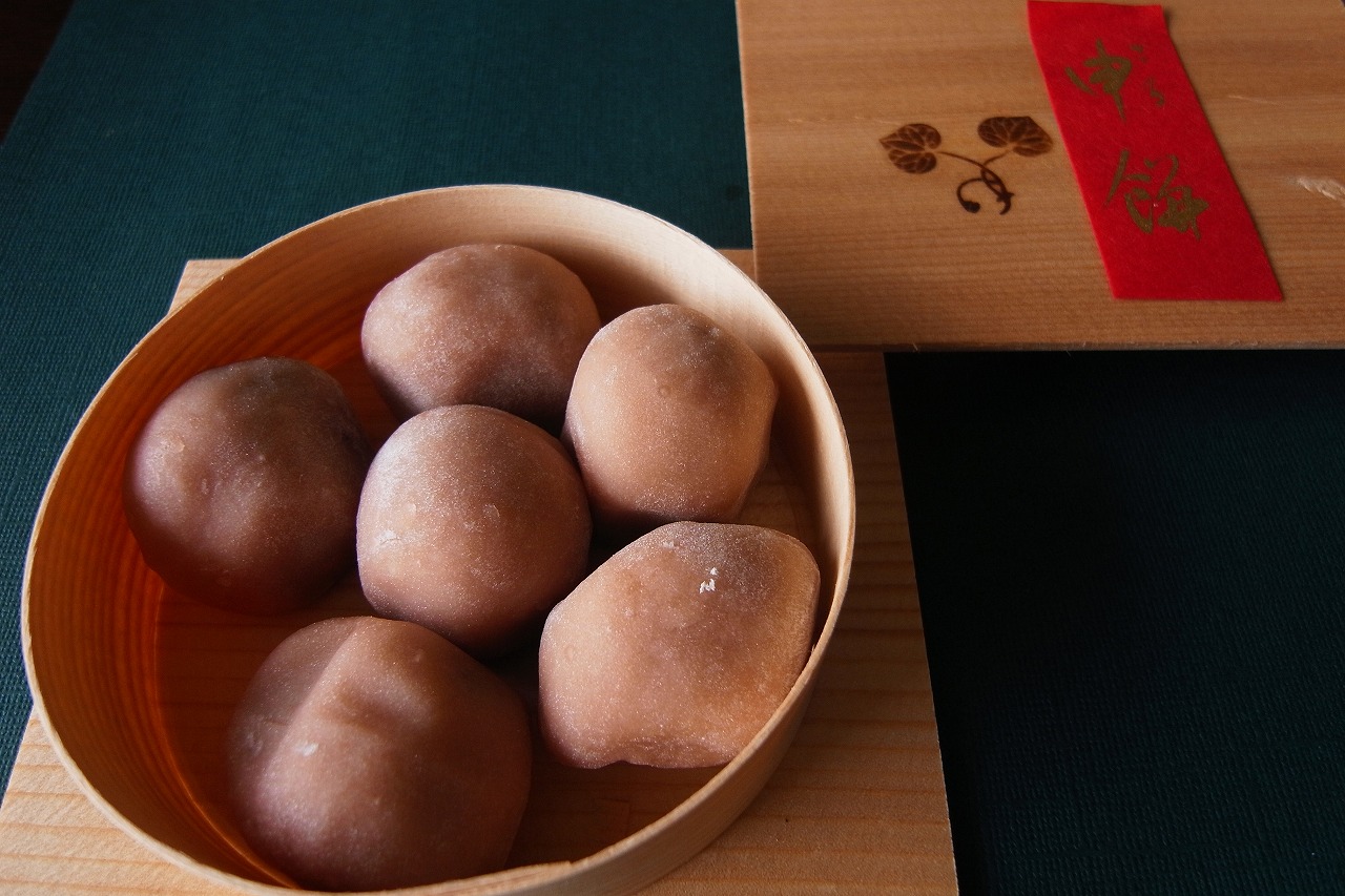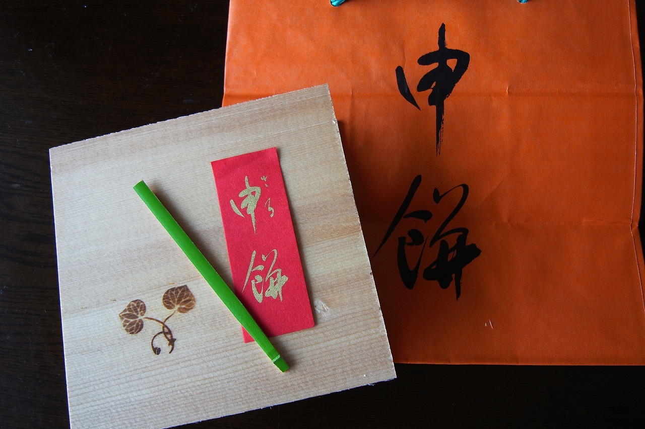 下鴨神社のみしるしは、葵の葉っぱ。葵の葉っぱは、きれいなハート型。半生菓子の銘菓は、ちょっとだけ日持ちがする。こちらは、さる餅が有名。葵祭の「申の日」に供えられていたお餅を、最近、約140年ぶりに復元されたのだそうだ。「はずね色」という優しい赤の一口サイズのお餅。