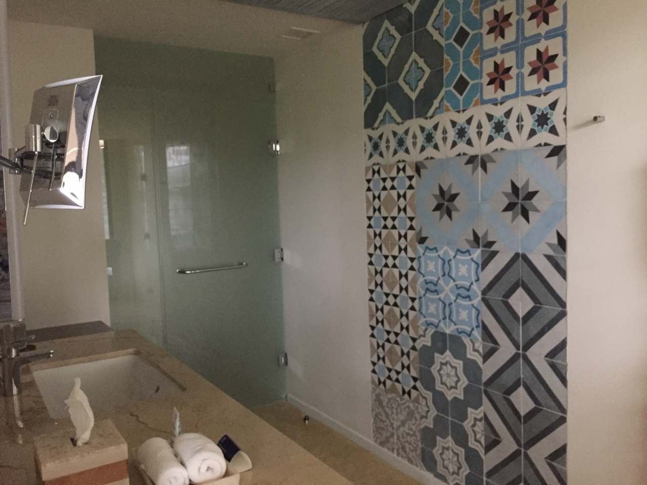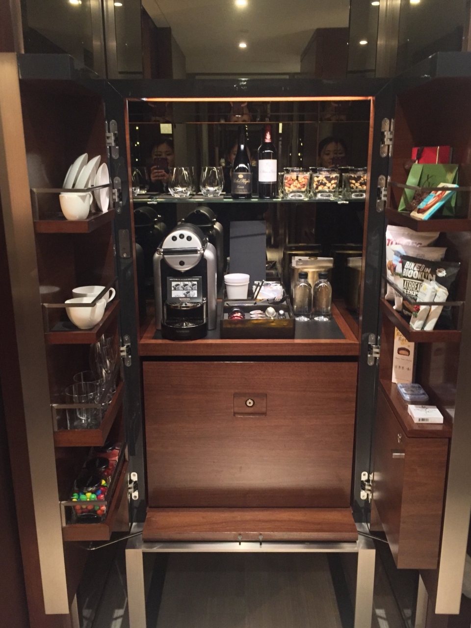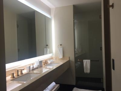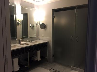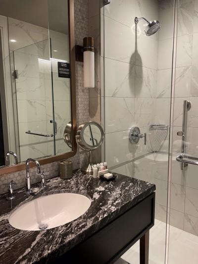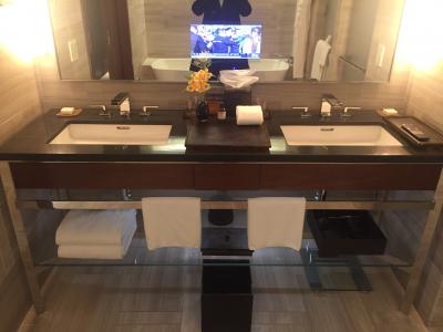内装は最新式で、クローゼット型のミニバーもとてもオシャレでした。シャワーとバスタブは別で、ダブルシンク、バスルームにもテレビがありました。ベッドルームのテレビには、「ようこそ◯◯様」と出ていて感激しました。