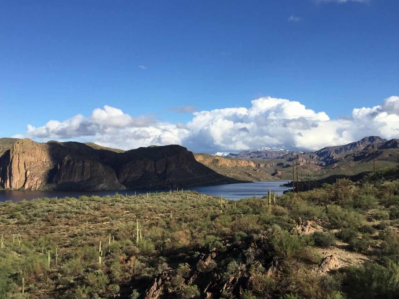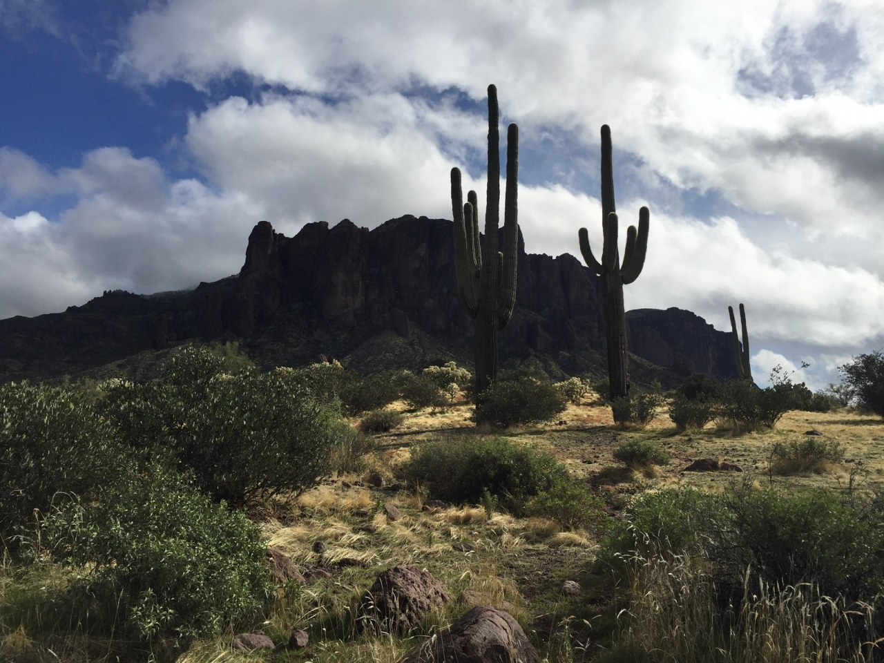 車をハイキングコースの入口に駐めて、歩き始めます。ニョキニョキと立ち並ぶサボテンを見ながら歩く、ハイキングコース。ゴールはロスト・ダッチマンの高い岩壁ですが、そこまで行かなくても、遠くに広がる山の景色も気持ち良く、清々しい気持ちになれます。もちろん無料です。