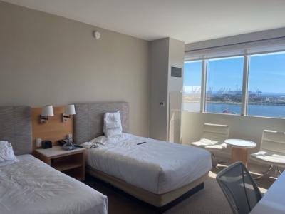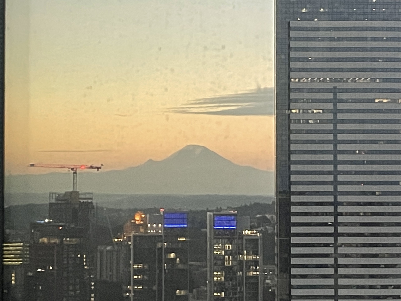 窓からタコマ富士と海の両方を眺められ、高層ビル群の夜景も美しく満足です。ラウンジは、コロナ以降、セルフのコーヒーマシンと、袋入りのスナック菓子のみですが、広々としたスペースで、PCで仕事するなら快適でしょう。