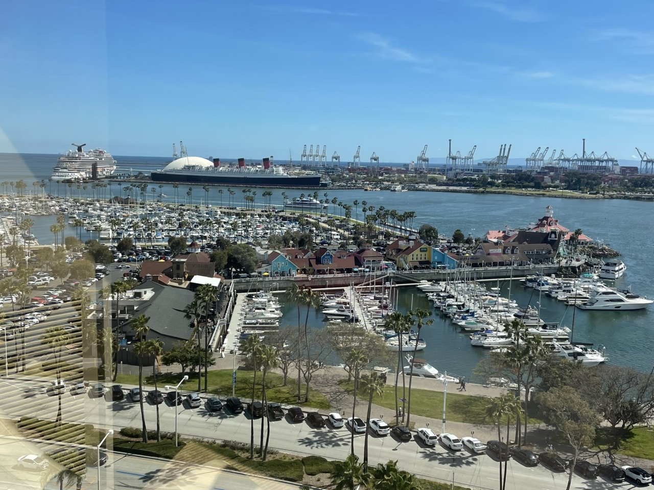 港にとまるクルーズシップ、観光用に固定されている古いクイーンエリザベス号、横浜のつばめ橋のようなきれいな橋、すぐ下のプール前の入り江では夜にライトアップされるスワンボートがゆっくり動き、プールサイドのファイヤーピットの回りで和む人達。景観に癒されます。