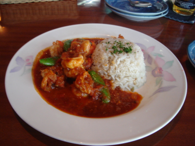 写真の料理、名前忘れちゃったけど、ガーリックライス&エビのチリソースがめっちゃスパイシーで美味しかった!!