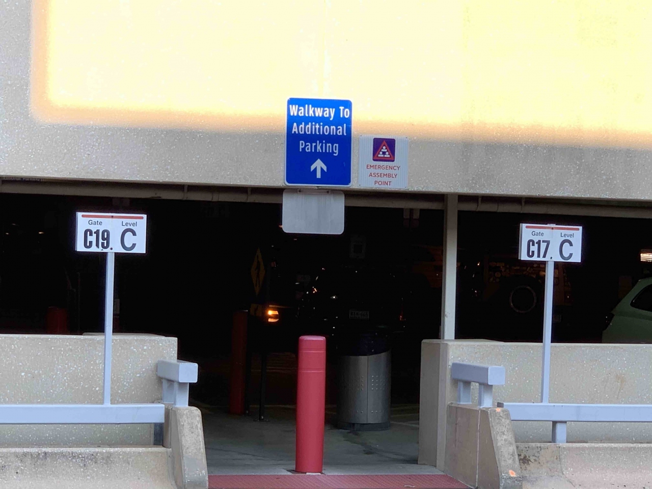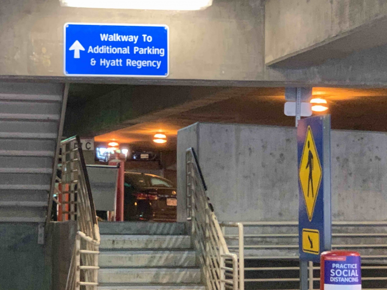 さて、Terminal Cからホテルへの行き方ですが、Terminal Cの地上階の Entry C19まで行き、駐車場に向かいます。駐車場の入り口には"Walkway To Additional Parking"という看板しかありませんが、とにかく駐車場に入れば次の看板で"Walkway to Additional Parking & Hyatt Regency"という看板がホテルまで途切れる事なく続きますので案内通りに進むだけです。注意しないといけないのは、途中3~4回階段での昇降があるので荷物の多い人は大変かと。ただ階段はいずれも10段以下なので頑張れないこともないかと。 ちゃんとしたホテルなので築年数は経っているかもしれませんが綺麗です。コロナ禍でも朝食はホテルのレストランで提供されました。ビュッフェ形式ではなく、好みのものをスタッフに言って、さらに盛り付けてくれる方式で、ハム、エッグ、ソーセージ、パン十分な内容でした。